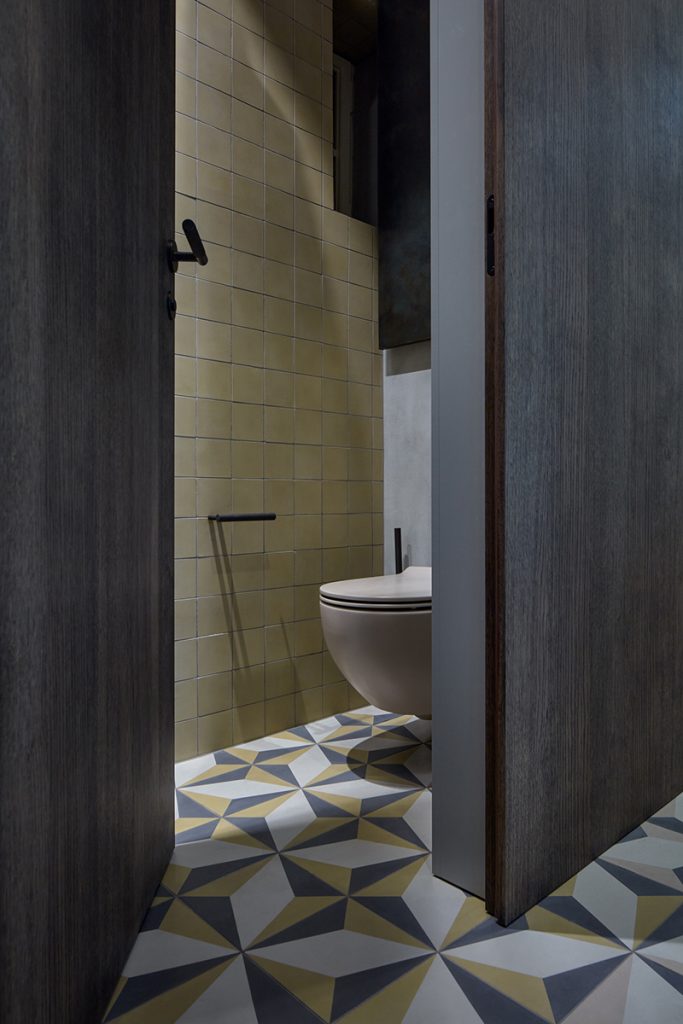 Încă de la intrare, noua organizare spațială apare ca fiind una clară, dar presărată cu elemente neașteptate, jucăușe. În hol, parchetul generează un flux dinamic și un joc de culori ce conferă spațiului un aer suprarealist. Acesta se continuă atât în baia principală, unde intră în dialog cu tonurile texturate de gri, de inspirație industrială, ale pereților, cât și în cea secundară, a cărei ușă este camuflată într-un perete placat cu lemn.