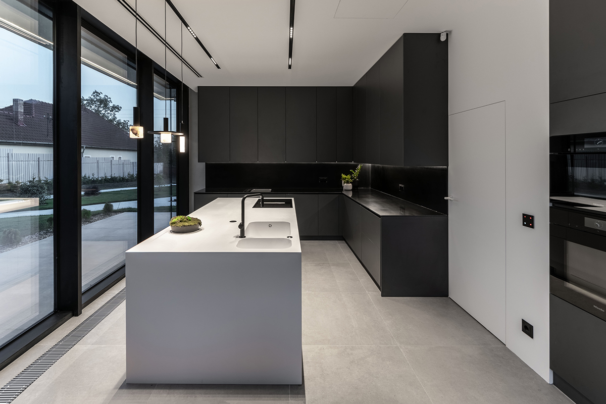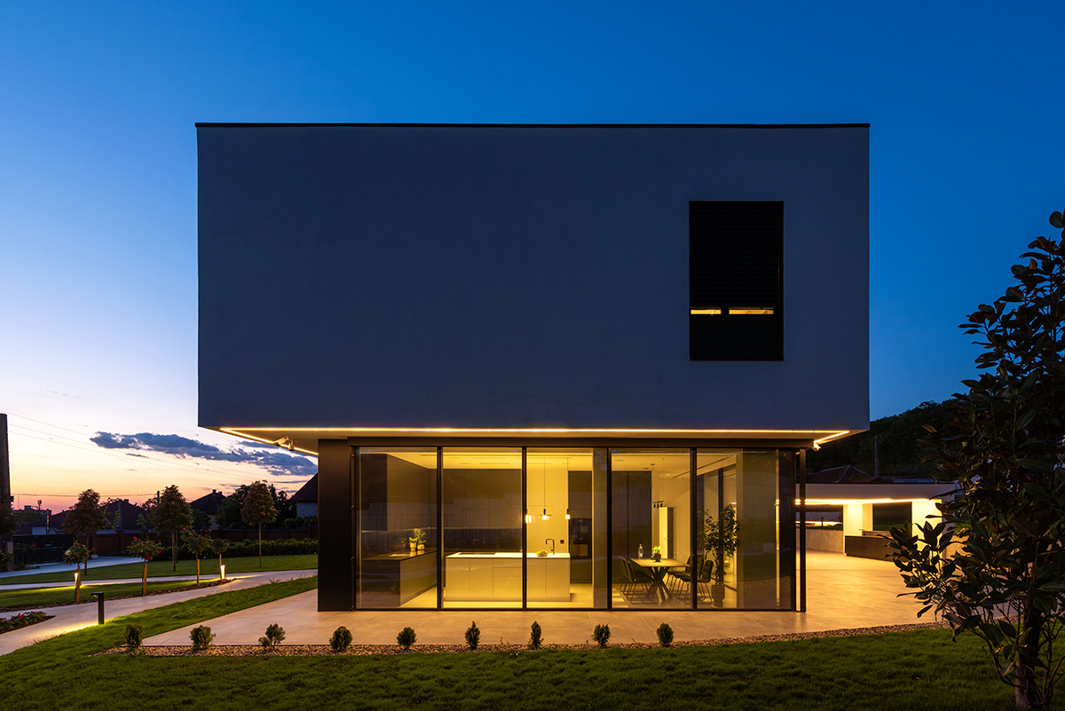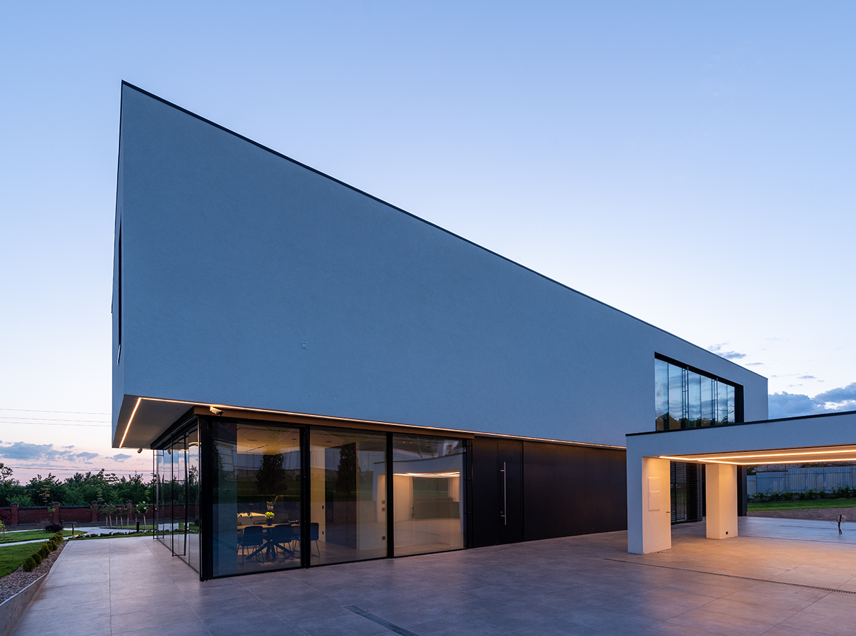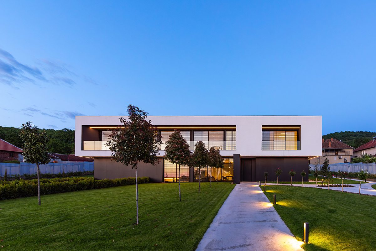 Situată în localitatea Sebiș din jud. Arad, această locuință mizează pe o arhitectură cu linii ferme, clare și unghiuri drepte. Atât geometria minimalistă a exteriorului, cât și contrastul dintre alb și negru, prezent pe fațadă, sunt continuate în interior, cu inserarea de elemente naturale precum lemnul sau verdele plantelor, creând un ansamblu coerent și o deschidere optimă a casei față de împrejurimi.