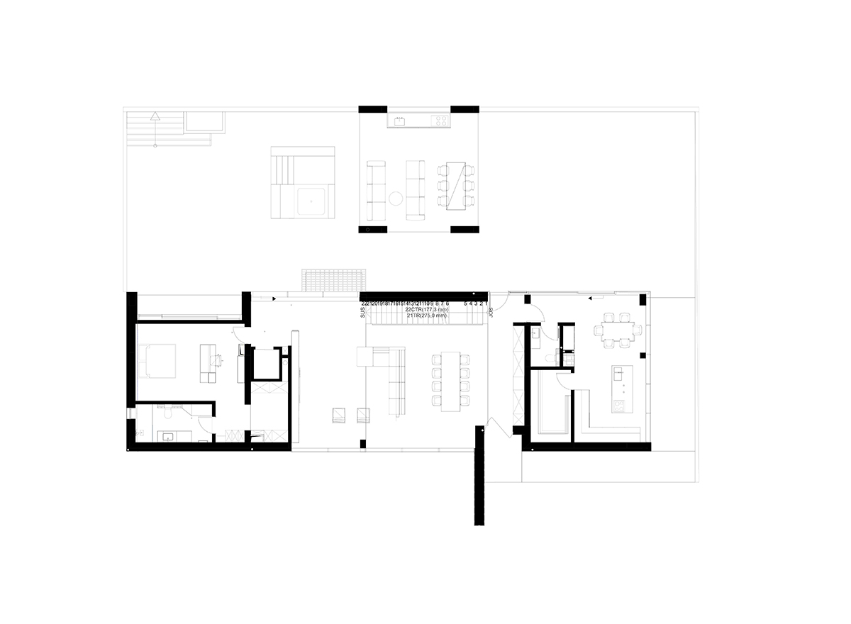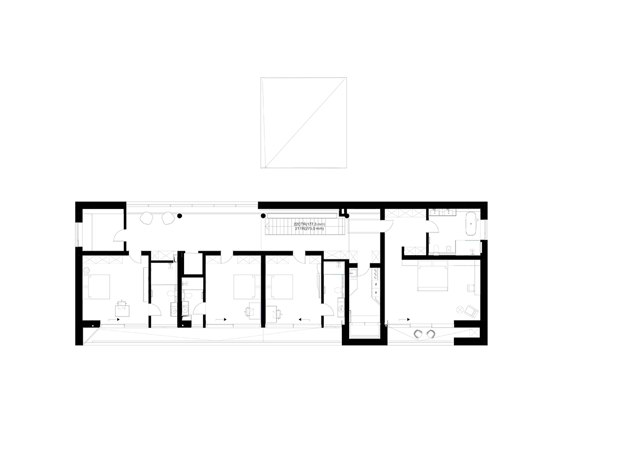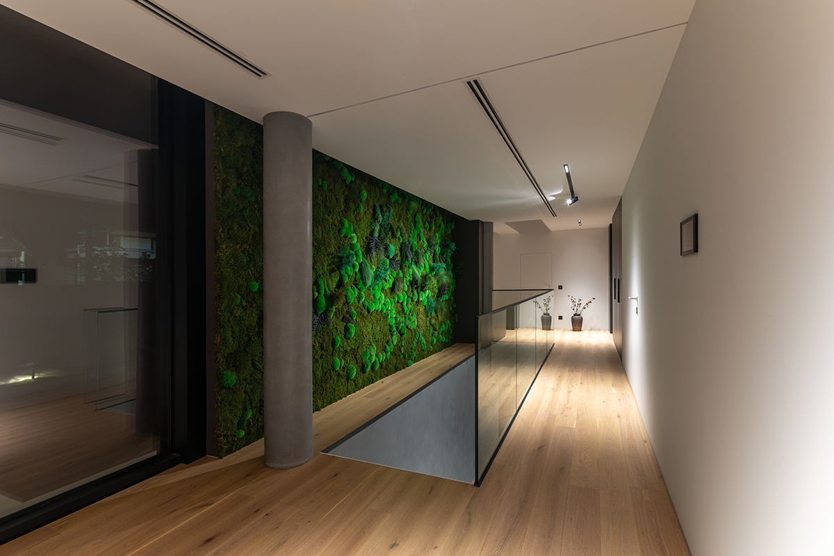 La etaj, locul scării este marcat de un perete verde din mușchi natural. Zona de noapte constă în patru dormitoare cu băi proprii și o cameră de lectură. Toate camerele privesc spre vale, iar terasele mediază tranziția între interior și exterior. Spălătoria este iluminată natural printr-o mică curte de lumină, închisă de fațada vestică a locuinței.