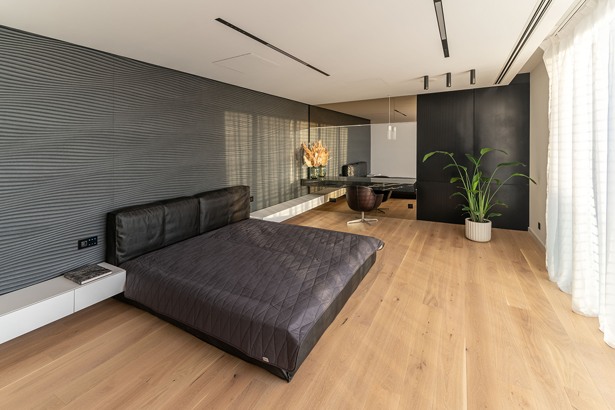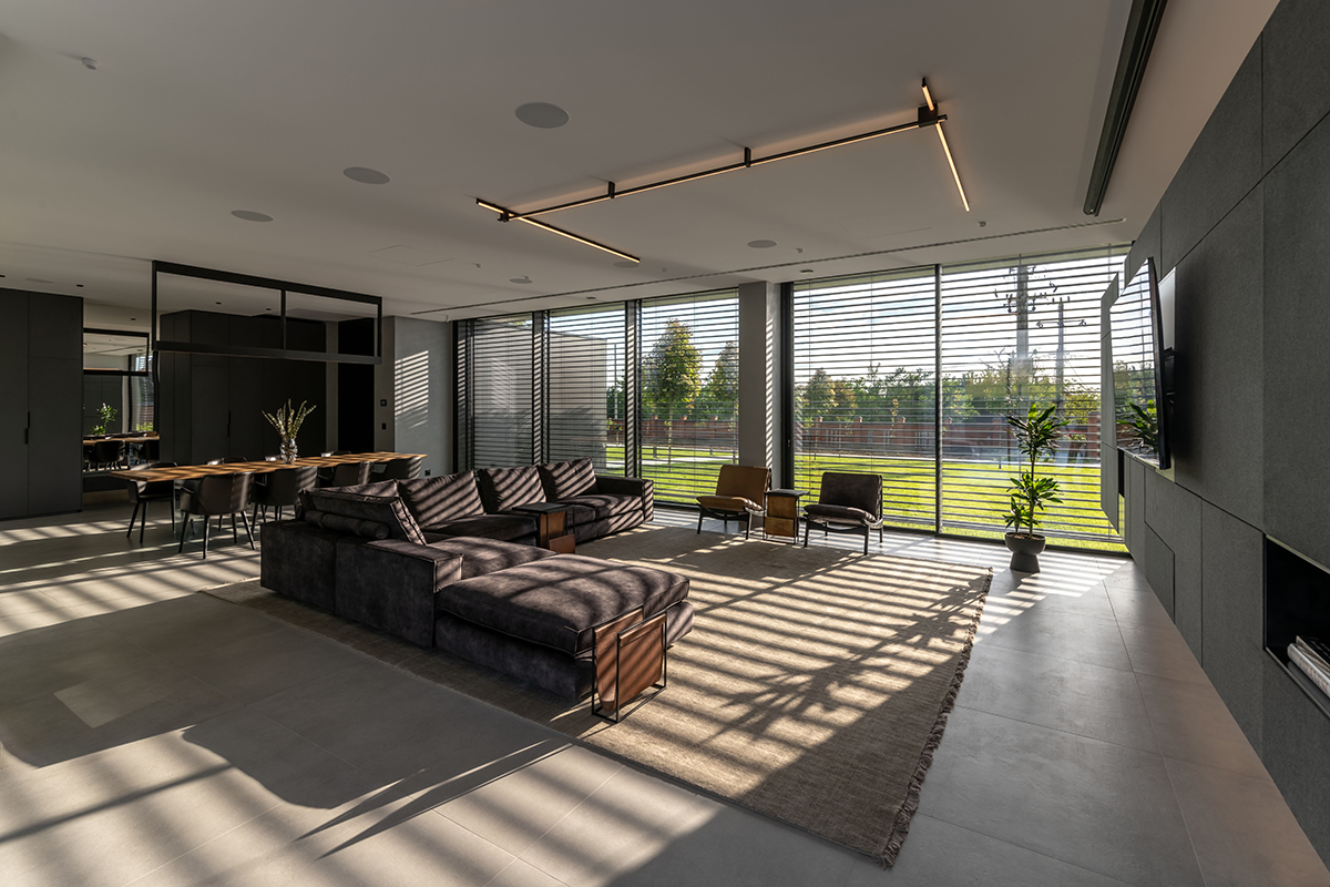Finisajele interioare au fost alese în așa fel încât să completeze și să pună în evidență conceptul arhitectural. Contrastul alb-negru, potențat de tonuri de gri și culori pământii, naturale, precum și de prezența lemnului, ajută la stabilirea unui dialog captivant între plantele din interior și liniile drepte ale arhitecturii. Soluțiile de depozitare, dezvoltate pe întreaga înălțime a camerelor, sunt fie ascunse, fie alipite pereților, pentru a facilita deplasarea și a menține continuitatea vizuală. În schimb, piesele de mobilier de sine stătătoare aduc o notă de varietate în ceea ce privește formele și texturile.