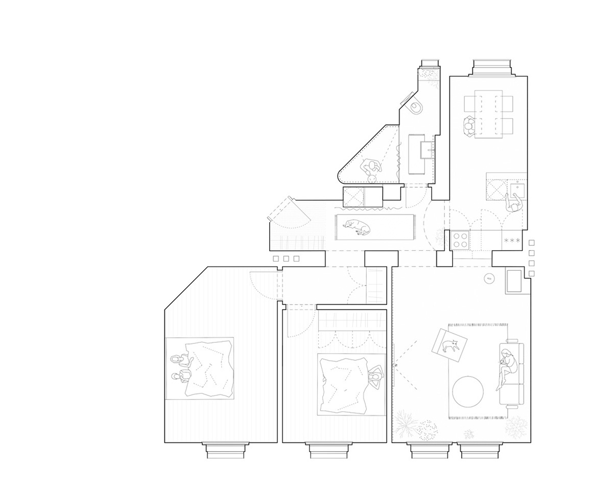 Interiorul rezultat este format dintr-un spațiu-nucleu folosit ca zonă de zi și două dormitoare separate. O unitate de bucătărie a fost inserată într-o nișă conectată de living printr-o fereastră interioară, un element comun în apartamentele de la începutul secolului 20. În dormitoare, podelele originale din lemn au fost păstrate și recondiționate, în timp ce, în baia modernă, spațiul este dominat de un duș generos, cu formă neregulată.