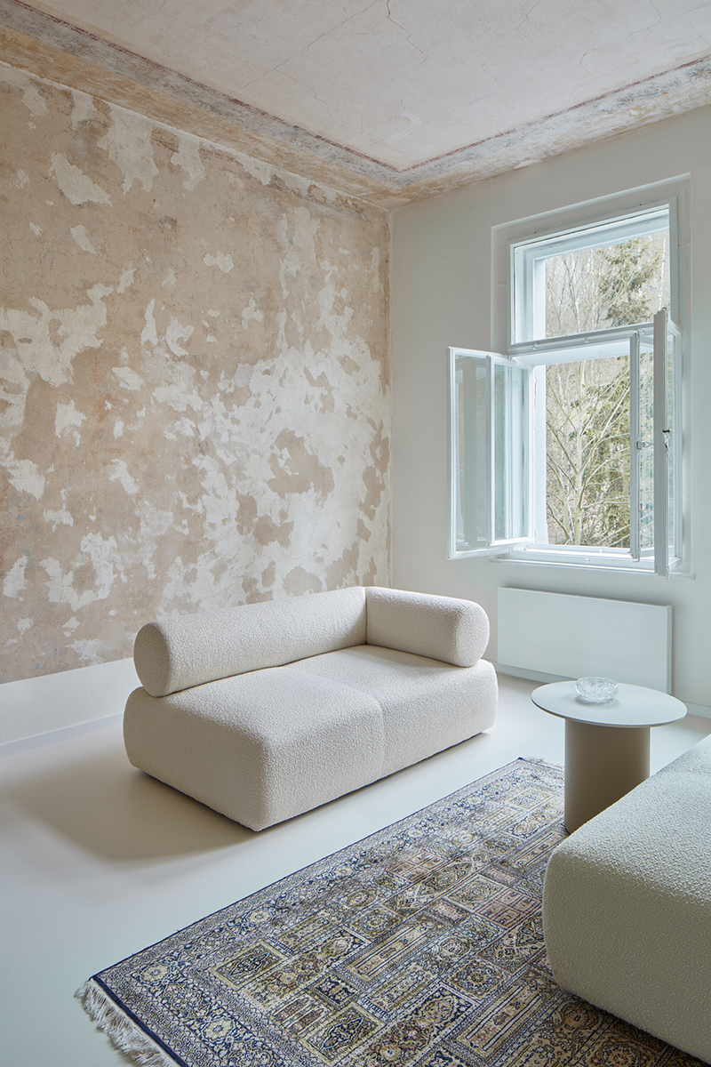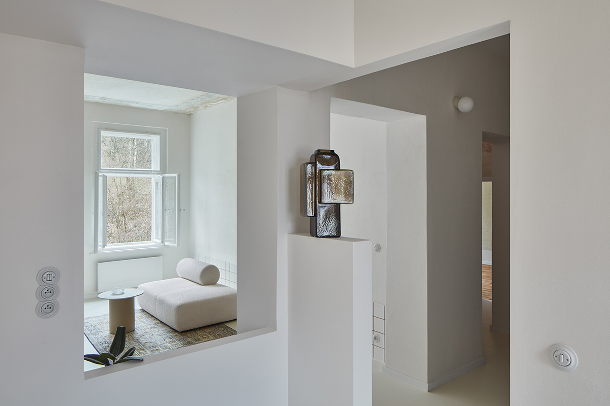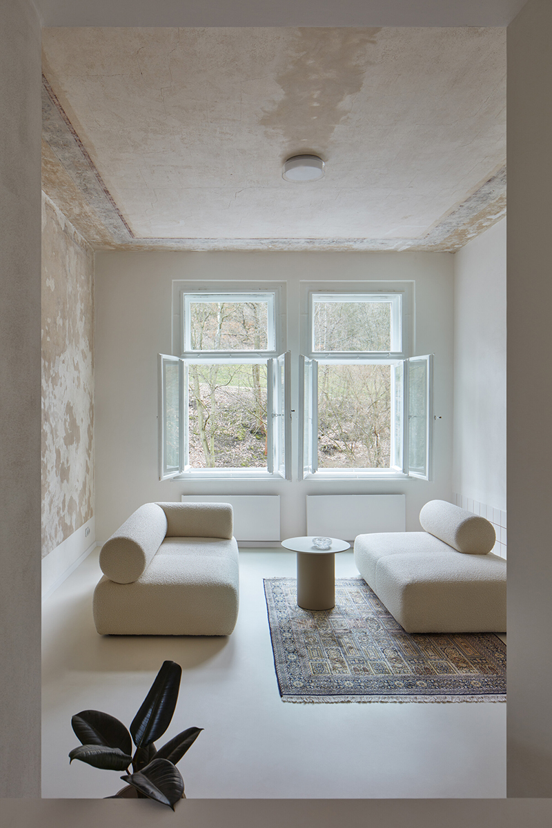 Finisajele minimale și atmosfera calmă aduc în prim plan vopseaua originală de pe plafoane și pereți, care devine leitmotivul interiorului, creând imagini puternice, asemenea unor opere de artă abstractă.