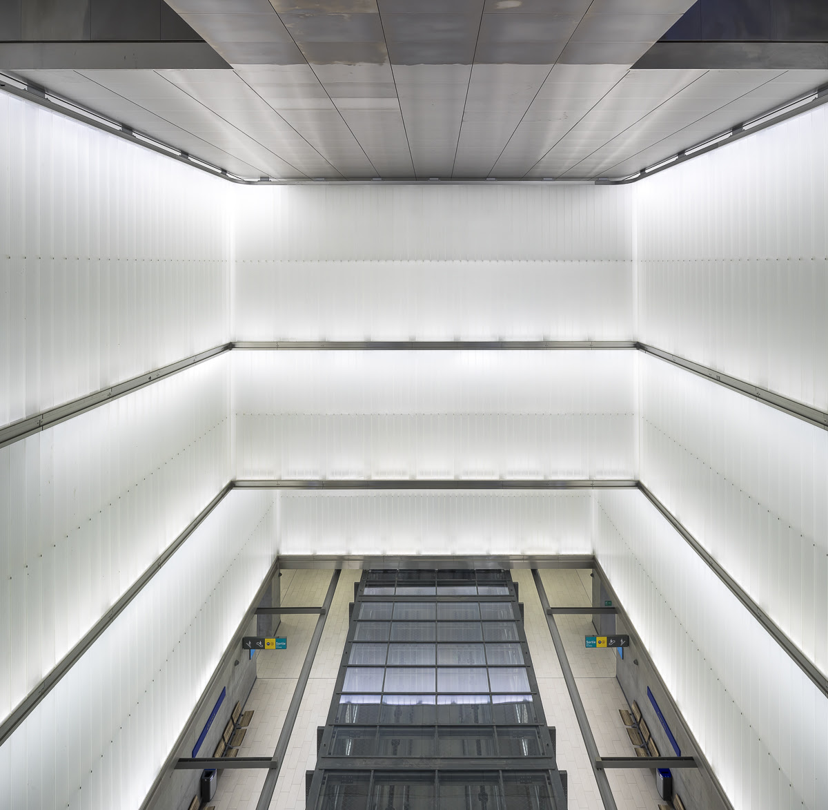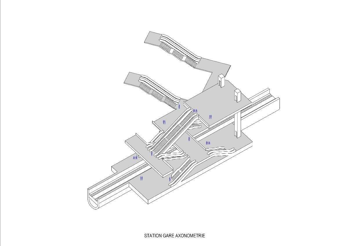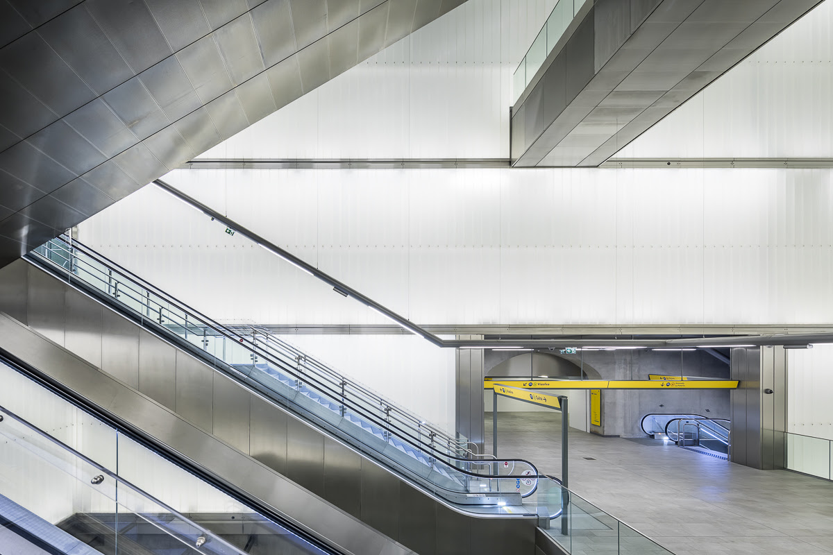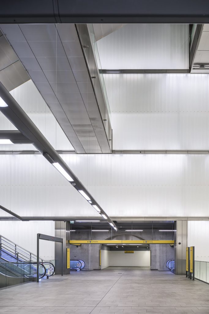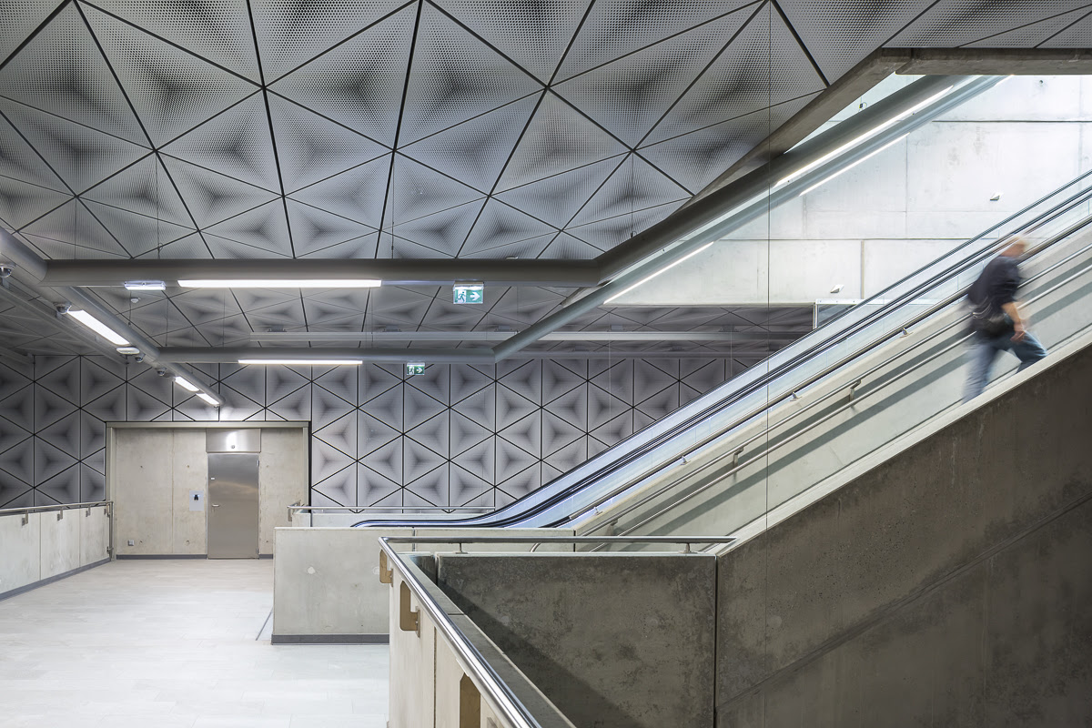 Grație prezenței din abundență a luminii naturale și artificiale, coborârea către zona peroanelor devine o experiență plăcută, oferind schimbări constante de perspectivă. Fluxul călătorilor este temperat prin introducerea mai multor niveluri intermediare suprapuse. Scările și lifturile au fost gândite ca structuri de sine stătătoare, a căror traiectorie străbate spațiul central în așa fel încât să permită percepția în ansamblu a acestuia. Deplasarea între șine este, de asemenea, facilitată, mulțumită prezenței podurilor pietonale.