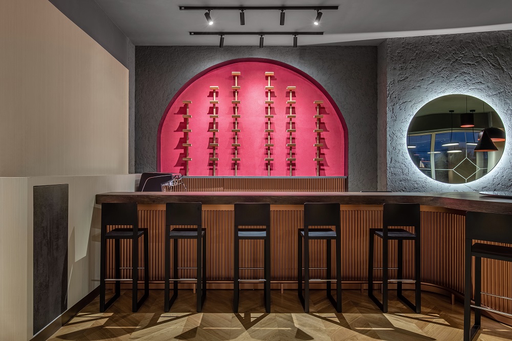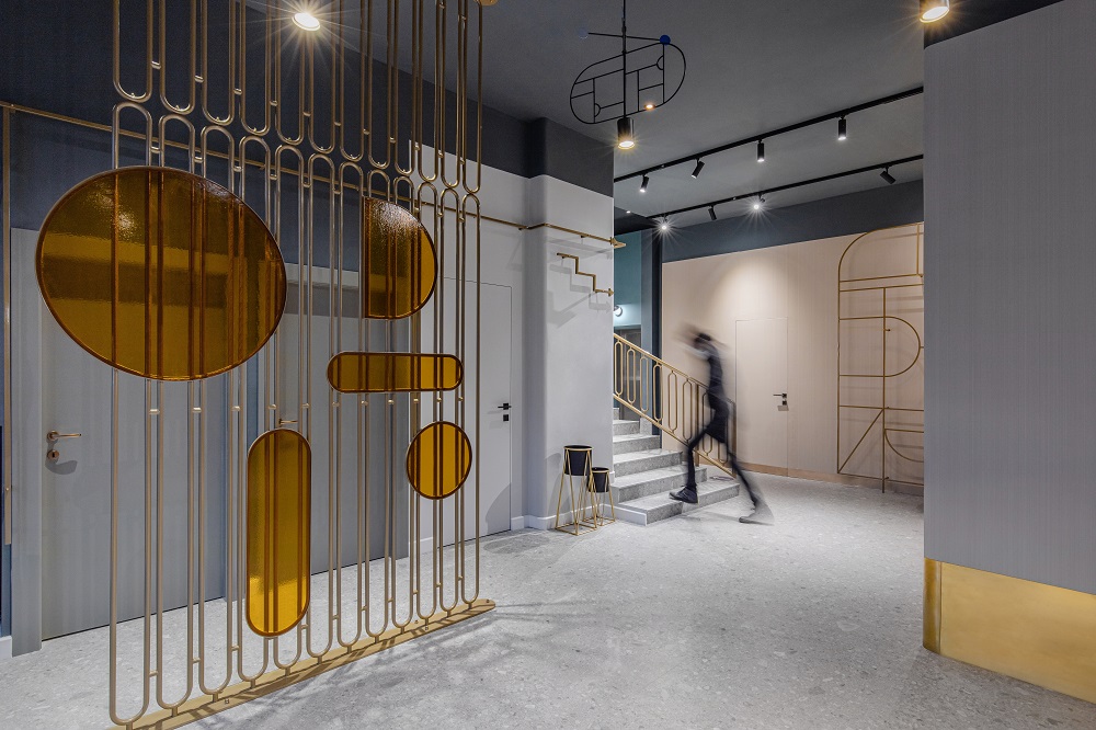 Fuziunea tuturor acestor ingrediente se întâlnește încă de la recepție unde texturile organice coexistă cu linii naturale și materiale precum metalul ori betonul dar și cu o varietate de culori care aduc dinamism și veselie. Zona restaurantului își manifestă eleganța prin materialele alese și prin liniile moderniste atemporale, revizuite. Nici de aici nu lipsesc formele organice și aerul modern rezultat din mixul de culori, texturi și forme.