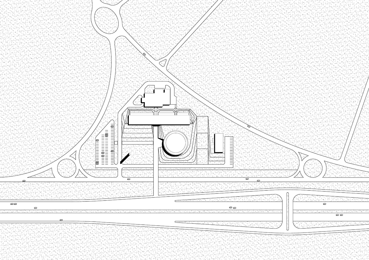 Proiectul se dezvoltă pe două axe principale. Axa nord-vest – sud-est conectează nava circulară, anexa și clădirea existentă din spatele terenului, ce găzduiește activitățile parohiale. Pe axa perpendiculară, nord-est – sud-vest, este amplasat volumul înalt al clopotniței, ce semnalează prezența lăcașului de cult și invită la contemplare. Integrarea deplină în peisaj este posibilă prin elevația volumului circular din beton, susținut de șase stâlpi ce fac parte din structura fundației îngropate. Astfel, lăcașul de cult își anunță prezența de la distanță, devenind un element constitutiv al peisajului, o poartă către dimensiunea spirituală a lumii.