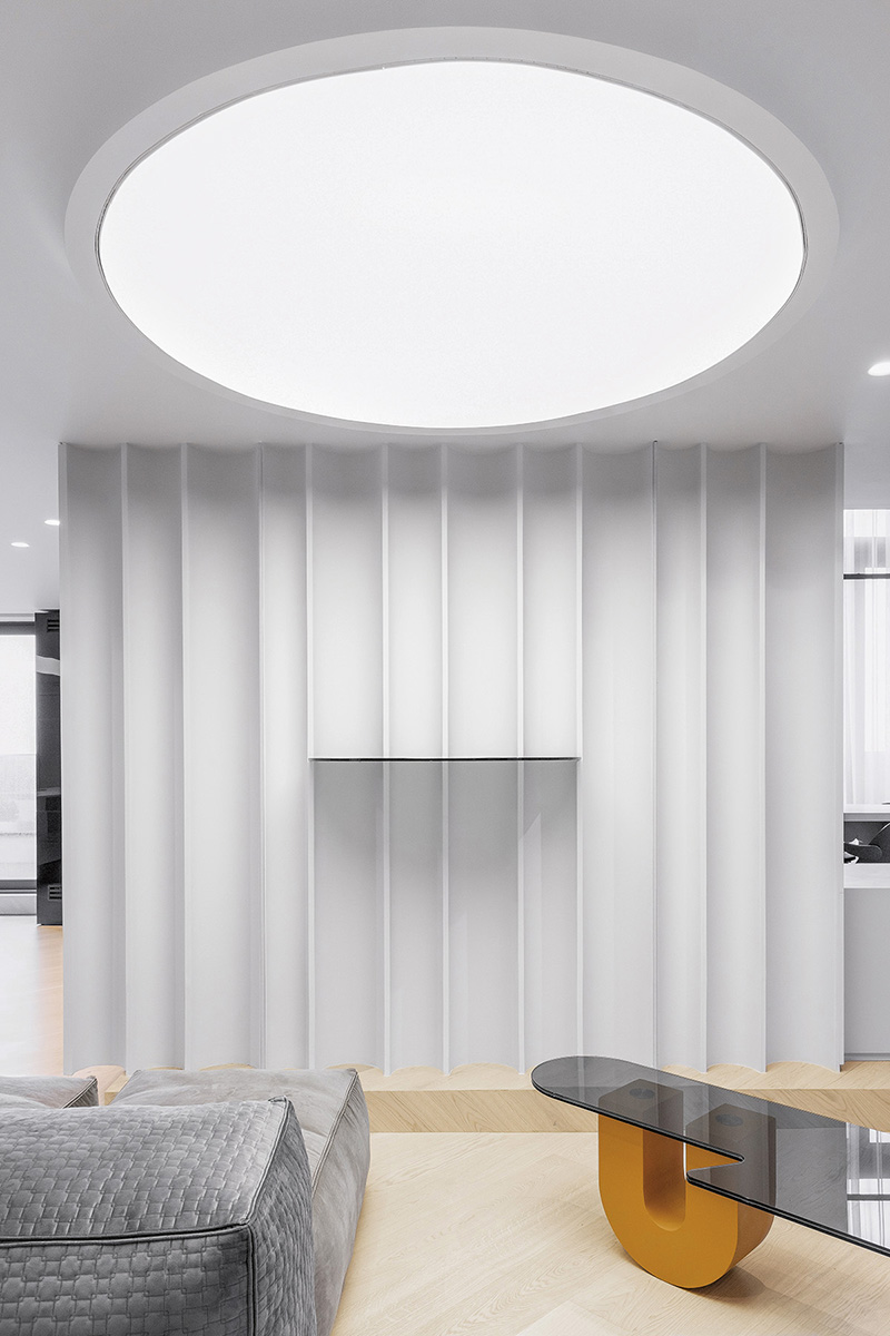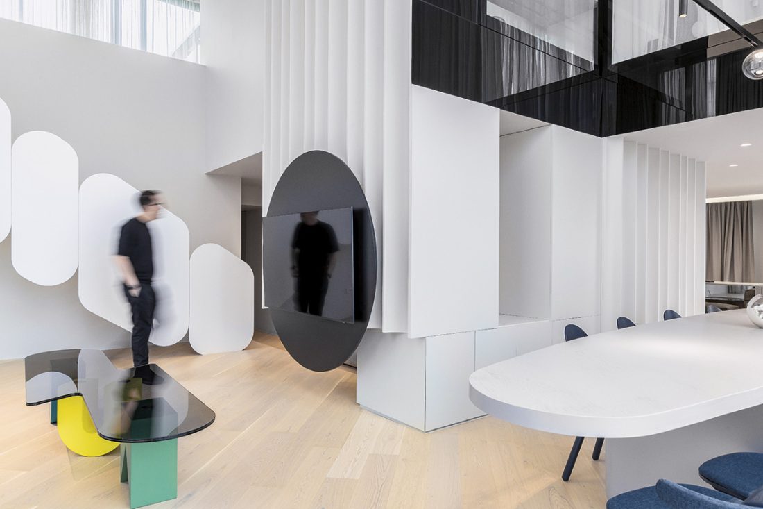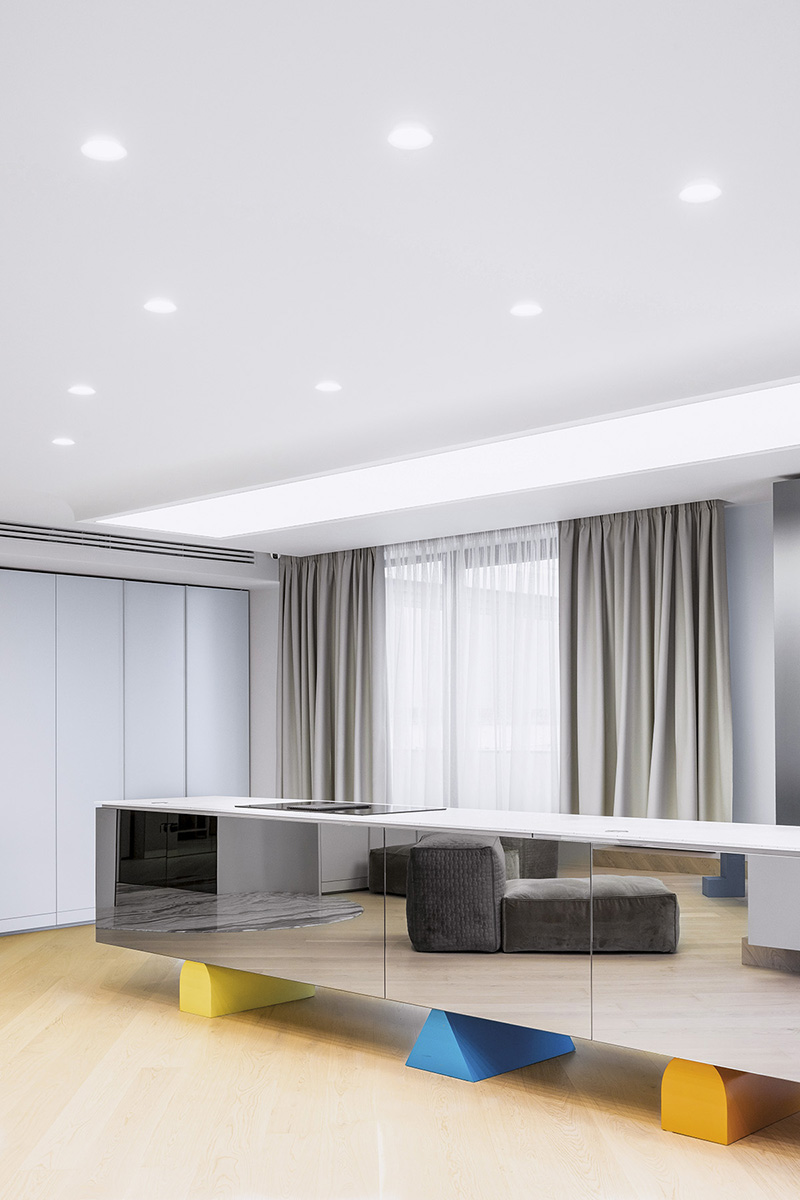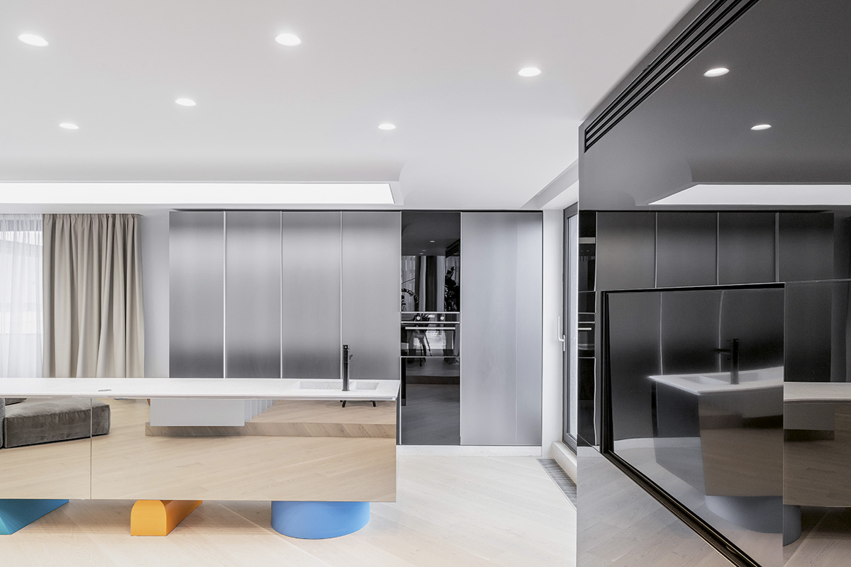 Salonul de primire, bucătăria, locul de luat masa, zona media și holul către dormitoare compun un scenariu al gradației, de la scenă deschisă și spațiu de circulație/respirație către o atmosferă de intimitate. Terasa amplă dintre cele două apartamente este un teritoriu de relaxare și de întâlnire în aer liber pentru întreaga familie. Decorativul în proiectele Phenomena nu ține de adaos ori de accesorizare, ci de o necesitate estetică intrinsecă conceptului. Prin urmare și aici elementele de ornament reiau, în mic, jocul formal al întregului: balustrada scării, corpurile de mobilier cu piesele lor ludice, cromatici, texturi și geometrii contrastante, pe un fundal general mai degrabă reținut, neutru. Soluțiile de iluminat, variate, adaptate funcțiunii fiecărei încăperi – de la „constelații” punctiforme și proiectoare mobile la suprafețe din membrane flexibile care devin luminoase –, amplifică dimensiunea spectaculară a interiorului.