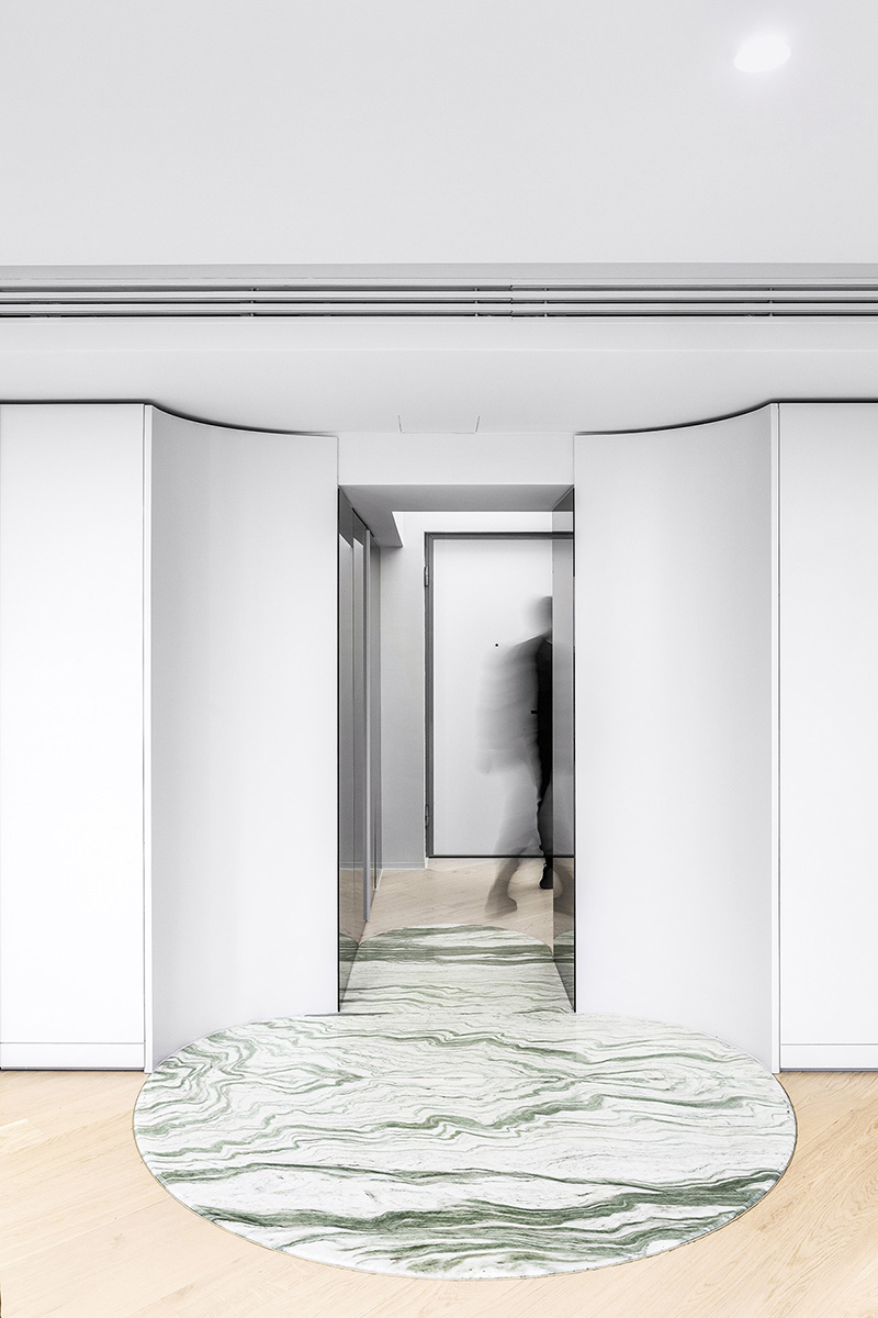 Proiectul reprezintă extensia unui apartament similar (proiectat anterior), cu o punte de comunicare la etajul superior: o pasarelă interioară ce unește fizic cele două entități marcate de un limbaj stilistic comun. La nivelul accesului general, spațiul de zi e structurat în jurul a două elemente verticale cu aspect monumental. Aceste lamele cu riflură inegală formează un ansamblu unitar și își găsesc corespondent în contra-curbele faldurilor textile ce accentuează înălțimea și deschiderea generoasă a ferestrelor-vitrină. Ca întotdeauna în creațiile Phenomena, componentele spațiale par a fi desprinse dintr-un întreg perfect coeziv, iar noile lor configurații, prin continuități și rupturi, prin complementaritatea liniilor curbe și a celor frânte, prin reflectare sau multiplicare, prin transparență și opacitate, trimit de fapt la această viziune primară, completă. Ele nu funcționează prin juxtapunere, ci printr-un principiu osmotic de ordonare – de aici efectul de coerență vie a ansamblului, de imersare.