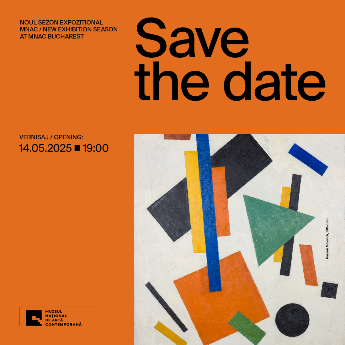 Surpriza acestui sezon o reprezintă expoziția KAZIMIR MALEVICH. SUPRAVIEȚUIRI, curatoriată de Mariana Dragu (Sala Auditorium, sponsor: Dental Clinic Herăstrău). Prezentate în premieră absolută, după spectaculoase peregrinări din Ucraina în Israel și apoi în România, operele lui Kazimir Malevich din perioada 1912–1916 marchează tranziția de la cubo-futurism la începuturile suprematismului – mișcare fondată de artist – și reflectă căutarea unui nou limbaj vizual abstract, ce avea să influențeze profund evoluția artei moderne. Expoziția oferă și o perspectivă inedită asupra influenței pe care a avut-o suprematismul în peisajul artistic românesc, prin prezentarea unor lucrări din colecția MNAC, fiind totodată și un memento al istoriei complicate a acestei regiuni în secolul 20.