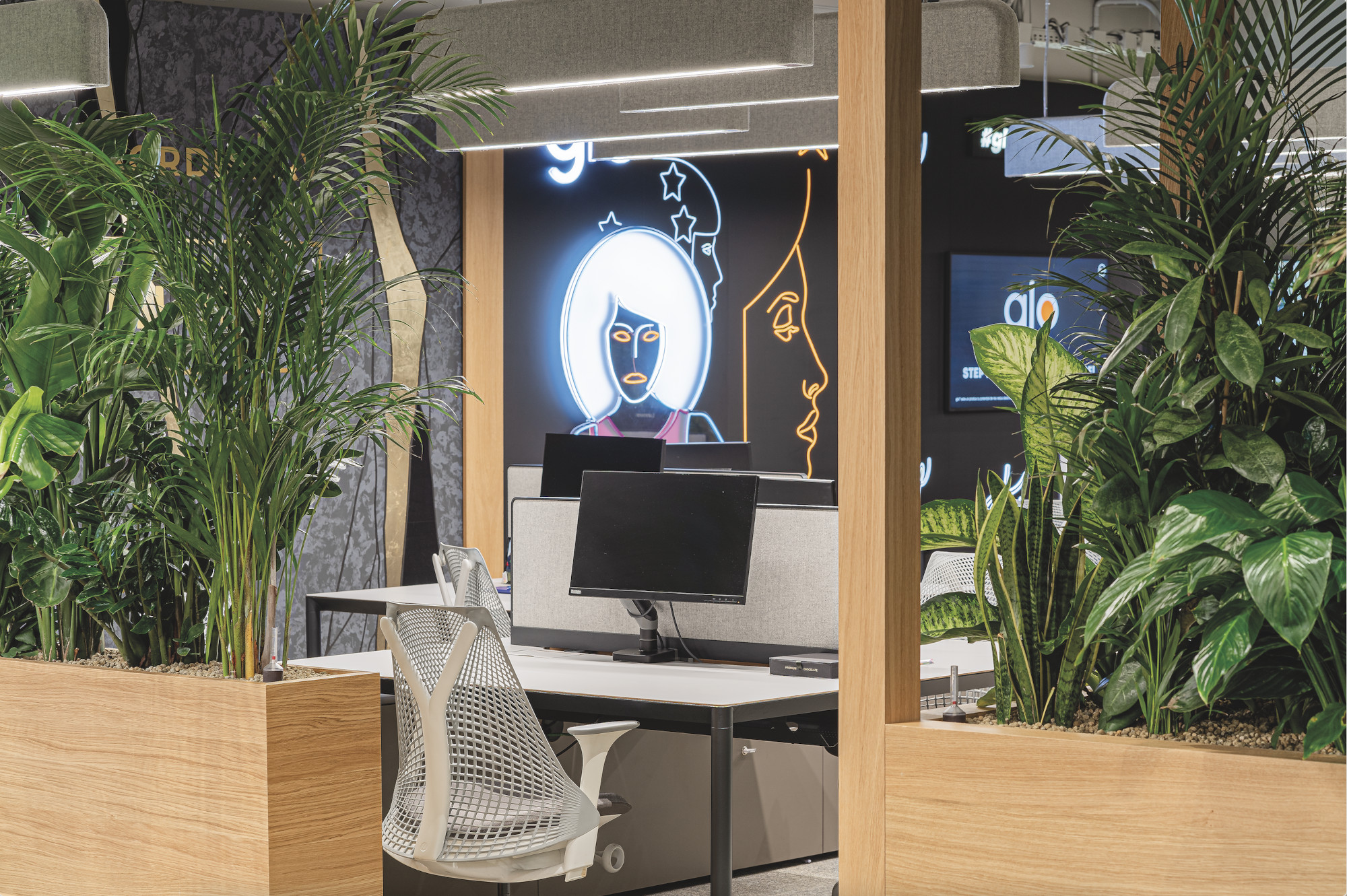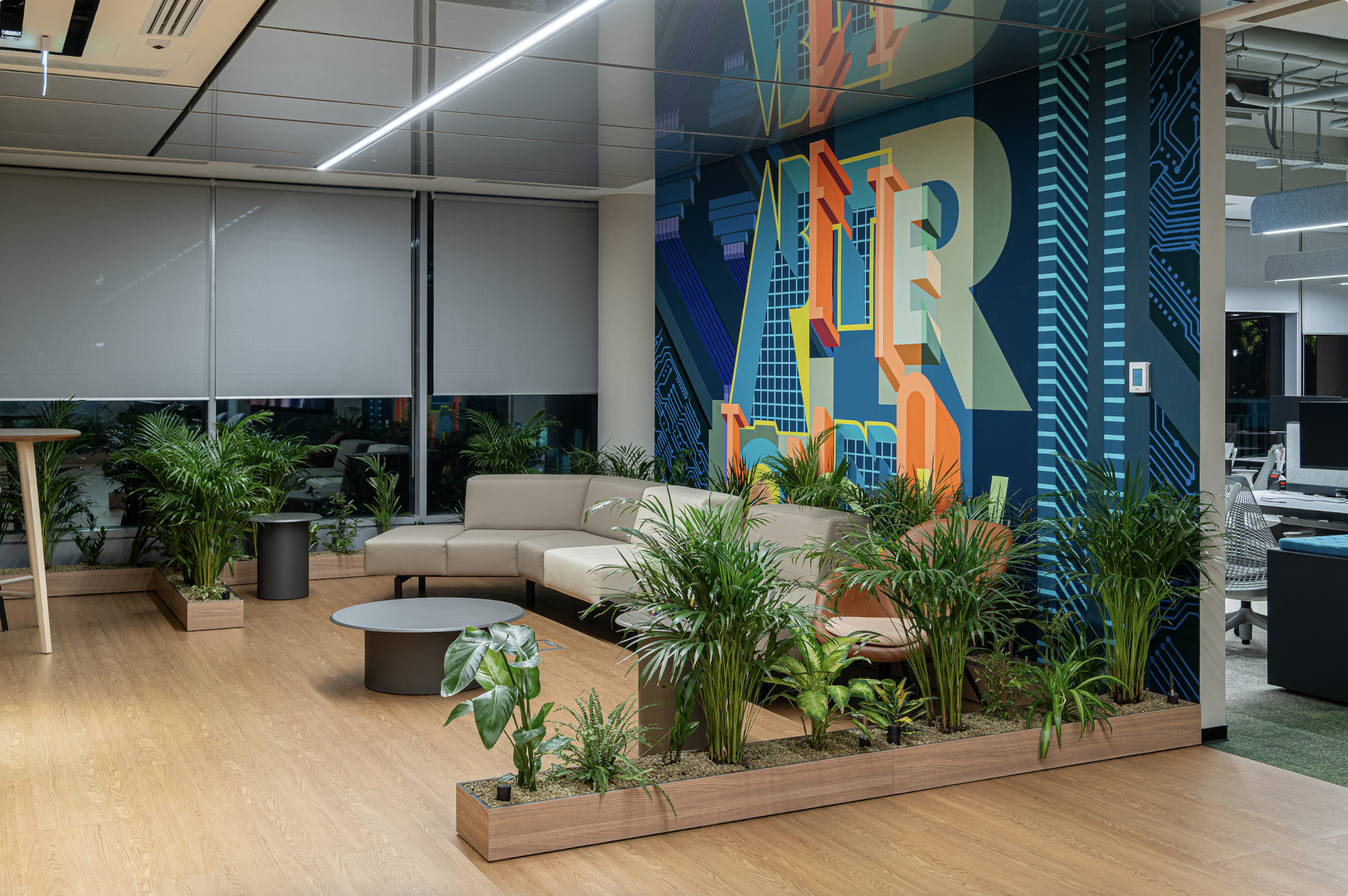 Prin cromatica puternică am dorit să obținem în general o atmosferă destinsă, cu accente optimiste și ludice. Am poziționat zonele principale precum birourile deschise, birourile închise și zonele de socializare astfel încât să beneficieze de expunere la lumină naturală. Am folosit din abundență plante în întreg spațiul, pentru a crea o ambianță naturală și caldă. Dincolo de amprenta lor estetică, vegetația contribuie semnificativ la reducerea stresului și la o calitate mai ridicată a aerului.