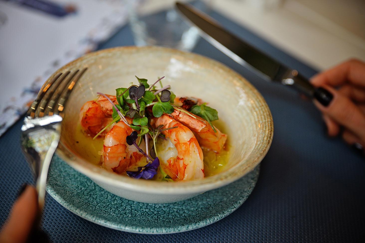 Creveți oltenești de captură cu praz, usturoi roz și sos de vin