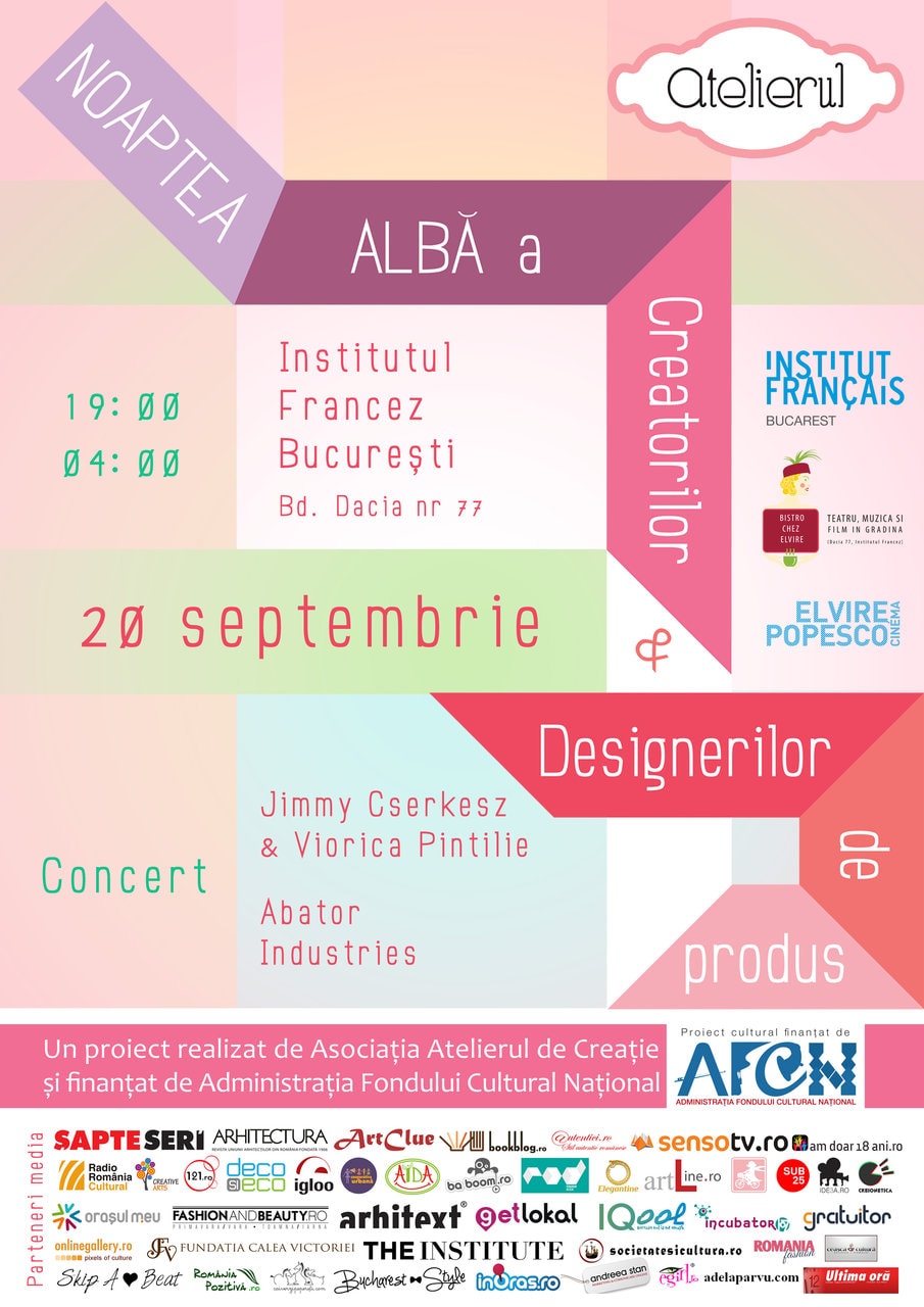 În data de 20 septembrie 2014 de Ziua patrimoniului european, Asociaţia Atelierul de Creaţie te invită la Noaptea albă a creatorilor şi designerilor de produs – ediţia a III-a, în trei spaţii de consum de cultură, toate aflate în Bucureşti pe B-dul Dacia, nr. 77: Institutul Cultural Francez, Bistro Chez Elvire şi Cinema Elvira Popescu.