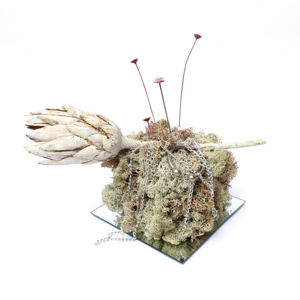 Mi-am îndreptat atenția către natură încă din anii facultății. În lucrarea de licență “2019. Consuming Space”, am analizat ideea de spațiu privat și cum acesta ajunge să treacă prin diferite forme în urma unor ritualuri iraționale pe care oamenii le fac în casă. Toată cercetarea a fost pusă într-o continuă comparație cu ideea de decor, dorința de înfrumusețare a căminului. Acest subiect a fost susținut de o serie de fotografii cu aranjamente florale și obiecte. La momentul respectiv referințele mele în domeniul floristicii se învârteau în jurul modelelor clasice, a buchetelor perfecte, unde fiecare petală părea neatinsă și fiecare floare clonată în așa fel în cât rezultatul să fie unul impecabil. Am început să caut floriști care au abordări unice, în felul acesta am reușit să înțeleg multiple modalități de prezentare a florilor. Mai apoi, lucrurile au început să devină clare: eram deja interesată să exersez și să realizez buchete și aranjamente, fără să țin cont de posibilele reguli.