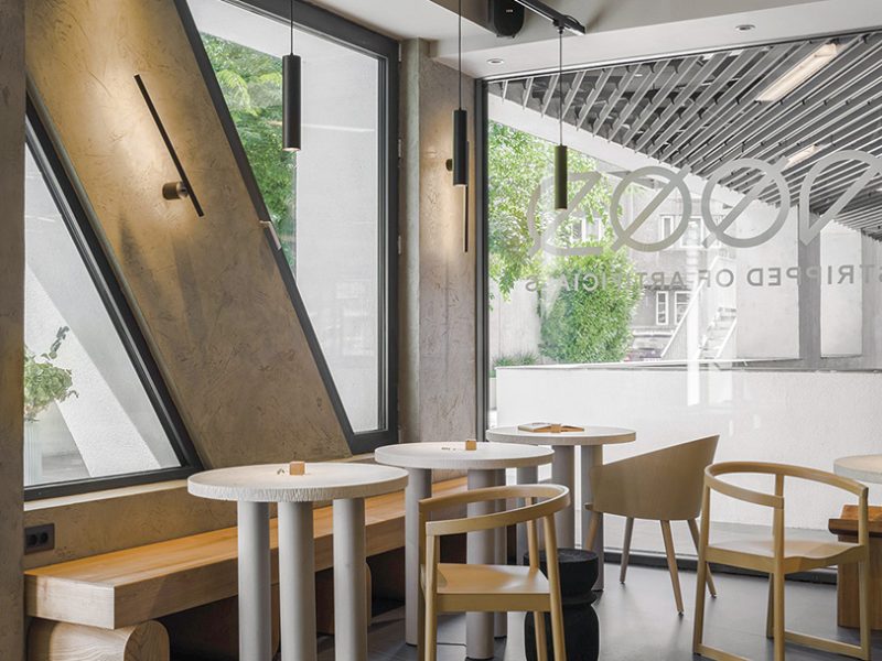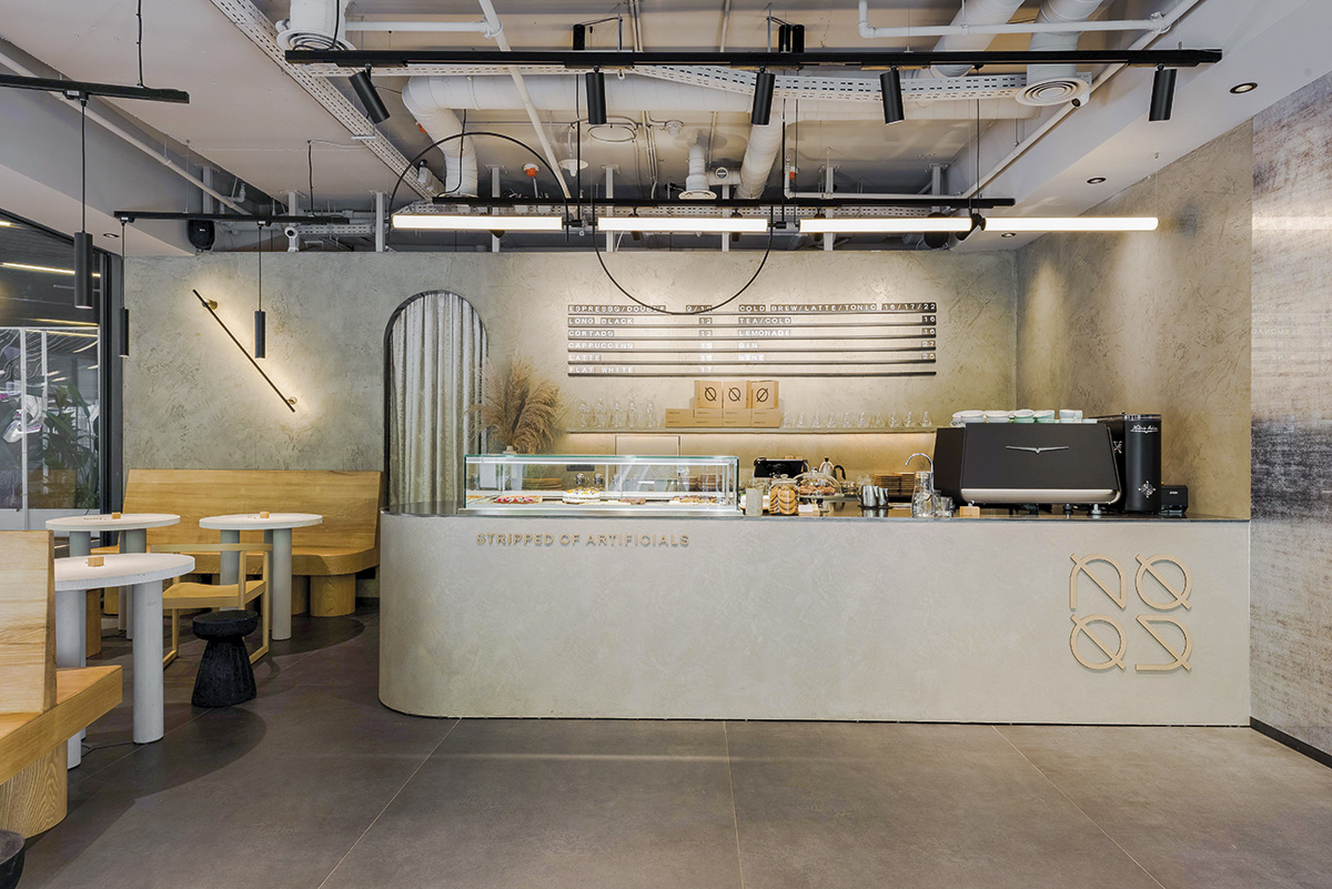 A rezultat Nood – Stripped of Artificials, un spațiu fermecător fără a fi ostentativ, fără plastic, unde cafeaua de specialitate de la Origo se poate combina armonios cu, spre exemplu, surprinzătoarea tartă de matcha, fără zahăr, cu miere bio, apă florală și fistic puțin sărat. De la Nood nu lipsesc nici vinul ori ginul și ale sale virtuți botanice. După ce alegi (cu greu) ceva din vitrină, te așezi să savurezi și spațiul unde arhitecții Andreea Cucu și Adrian Ciorgovean (A. DE I. DESIGN) au încercat să transpună prin design dorința beneficiarilor de a crea o experiență memorabilă, inedită. Dar mai ales eliberată de tot ceea ce este neesențial, prin urmare materialele naturale (piatră, lemn, sticlă, tencuieli ecologice decorative etc.) nu fac decât să completeze produsele în spiritul stilului de viață sănătos promovat de Nood.