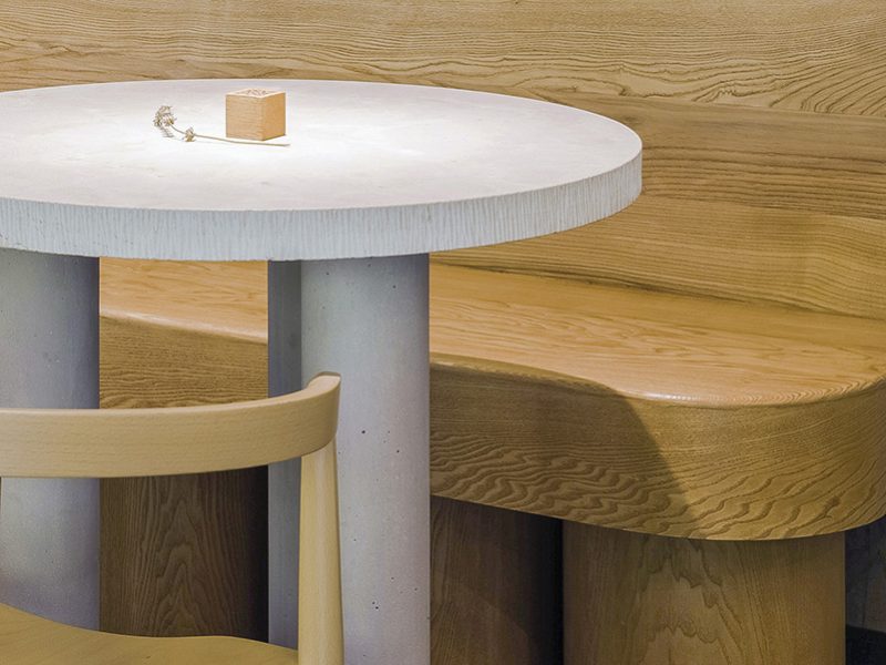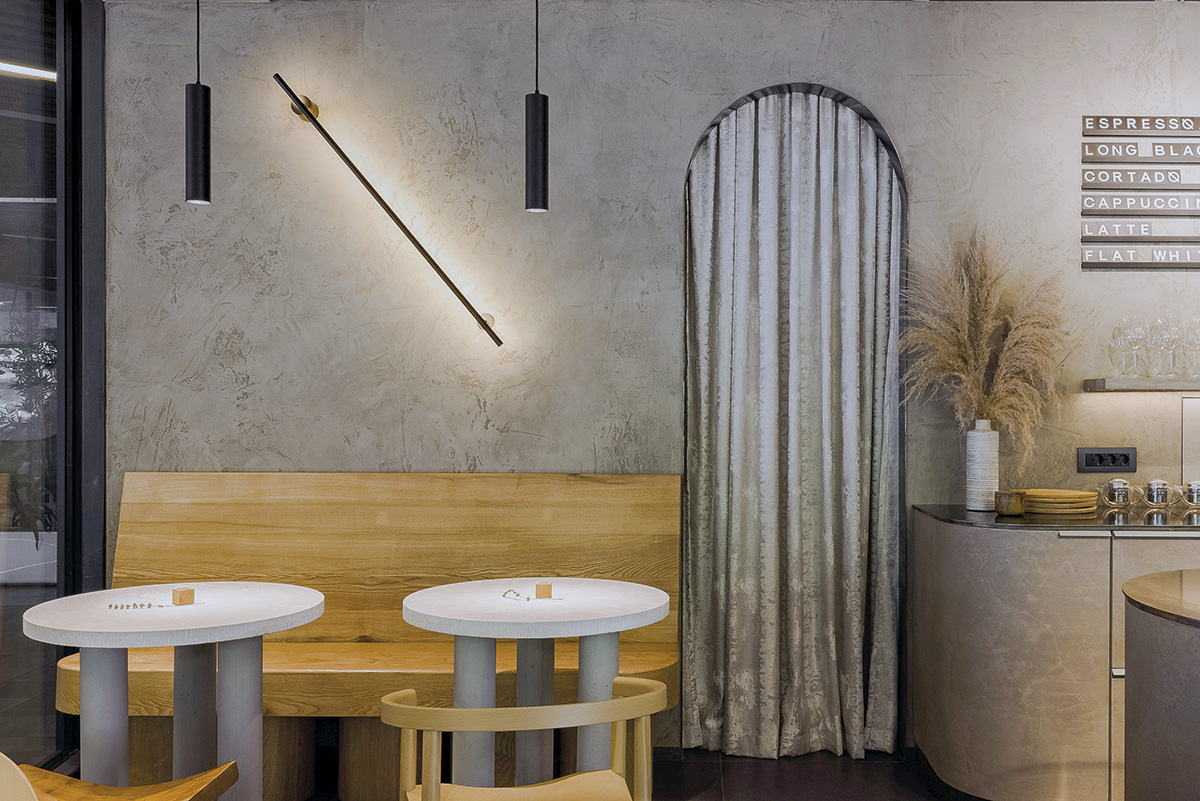 Spațiul este astfel „dezbrăcat” de toate cele nenecesare, devenind un ambient odihnitor grație tonurilor neutre care merg de la cimentul crud și „pardoseala ceramică porțelanată cu tente de oțel oxidat, gri-închis” până la nuanța naturală a robustelor banchete din frasin. Mobilierul devine sculptural datorită meșteșugului lui Ioan Moldovan, iar motivul formelor precise, geometrice este reluat și la nivelul arcadei romane sau al corpurilor de iluminat care pun în valoare barul și vitrina cu adevăratele vedete: tartele și biscuiții, continuând să arunce accente discrete în restul spațiului. Pentru zilele călduroase există și o terasă. Prin urmare, spor la descoperit și degustat!
