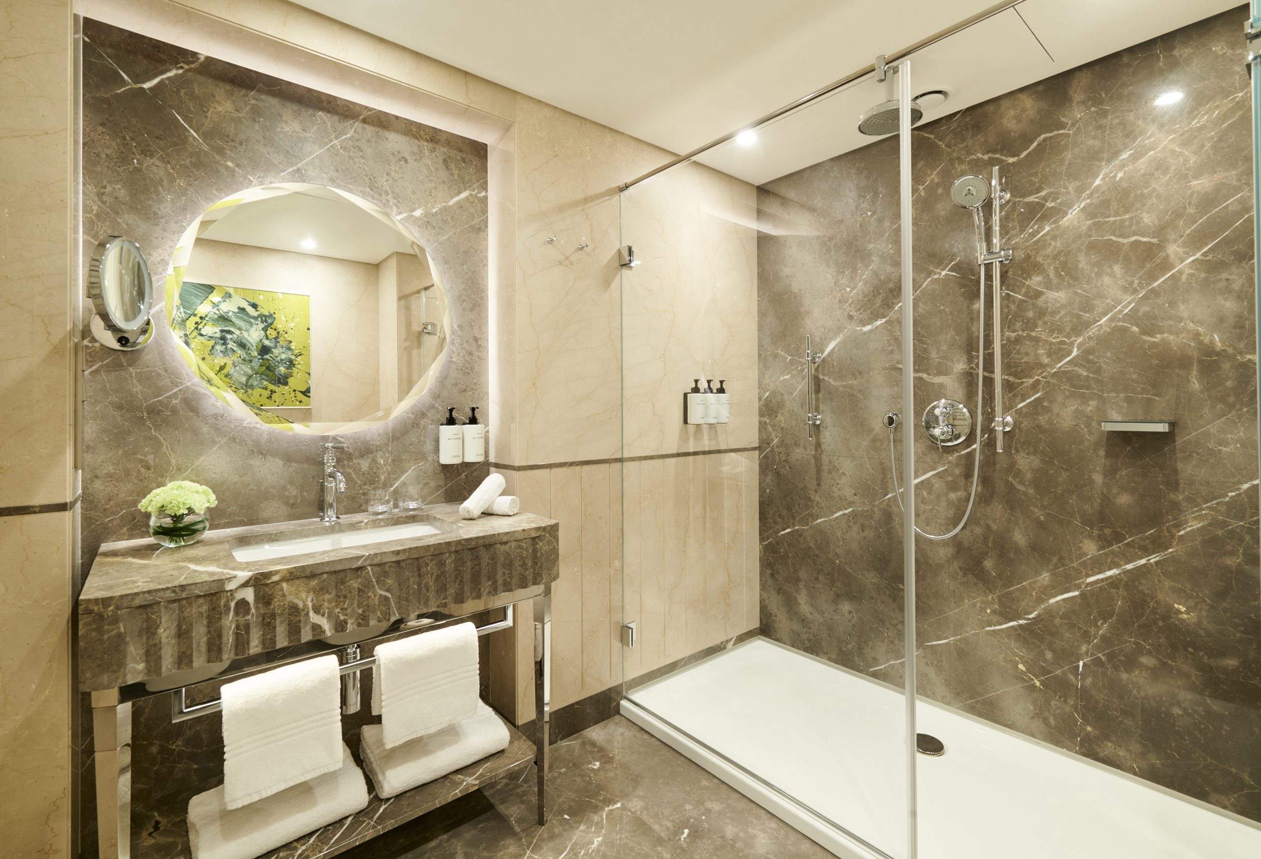 Conceptul de design al hotelului îmbină armonios aspectele contemporane ale vieții de zi cu zi cu eleganța și istoria sa bogată. Paleta de culori selectată este dominată de tonuri neutre, completate de nuanțe de verde, care subliniază utilizarea materialelor naturale de calitate superioară. Parchetul din stejar periat și bizotat adaugă un element de rafinament, în timp ce pereții împodobiți cu profile ornamentale din lemn de fag conferă o notă distinctivă. Băile amenajate cu marmură naturală de Botticino și Grigio Imperiale în nuanțe calde creează un spațiu de lux cu o eleganță autentică. Toate aceste detalii atent alese și finisate cu grijă contribuie la crearea unei atmosfere captivante și pline de rafinament.