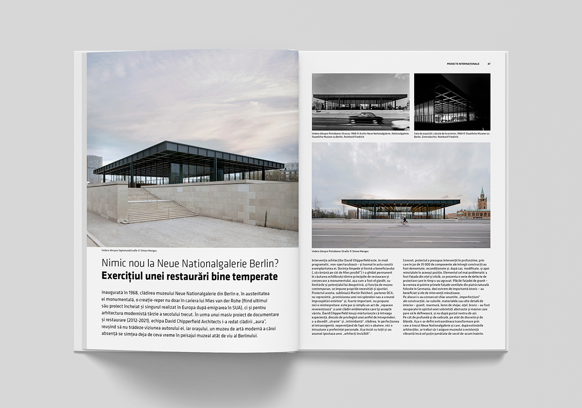 Rubrica „Proiecte internaționale” se conturează printr-o serie de trei lucrări de arhitectură pe care le considerăm referențiale: Tanzhaus Zürich Cultural Center de Estudio Barozzi Veiga, Neue Nationalgalerie de Studio David Chipperfield Berlin și Geo and Environmental Centre de KAAN Architecten, nominalizat la premiile Mies van der Rohe în 2022.