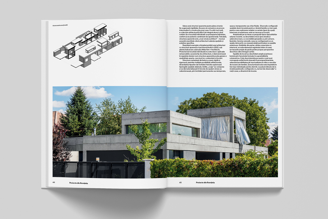 Rubrica Proiecte din România aduce în paginile revistei șase proiecte eclectice care cuprind întreaga plajă a funcționalității: sediul companiei DACCA din Cluj-Napoca – proiect coordonat de arh. Sergiu Tîrziu (Format 4) –, un imobil cu o siluetă arhitecturală ritmată, de o eleganță subtilă; WIN Herăstrău – un ansamblu de cinci imobile de apartamente, spații comerciale și birouri, realizat de Metrik Architecture –, care aduce locuirii colective o geometrie armonioasă; o „casă de autor”, realizată sub atenta îndrumare a biroului Attila Kim Architects, un proiect ce propune un gest al arhitecturii experimentale, dar și un exercițiu de onestitate structurală dezarmantă. Un retreat nou, în Măgura, realizat de ADN BA, mânădelucru, CRAFT și conturat după conceptul estetic japonez Iki – o expresie poetică a grației și a simplității; The Edit, o „casă” a designului, atent curatoriată (amenajare realizată de echipa Bogdan Ciocodeică Studio împreună cu inițiatoarele proiectului, Irina Pogonaru și Magda Staicu), dar și un imobil de patrimoniu realizat de arh. Octav Doicescu – bufetul-restaurant modernist din Grădina Botanică, Cotroceni.