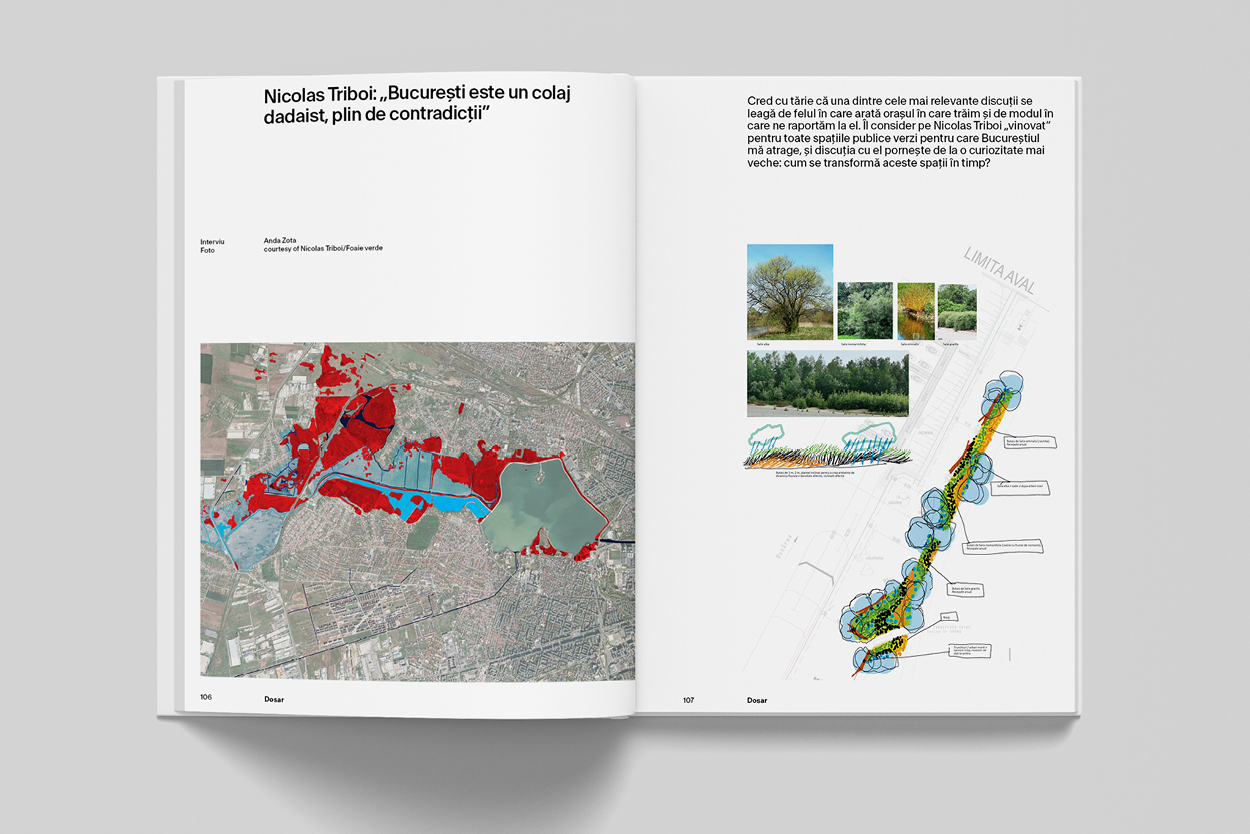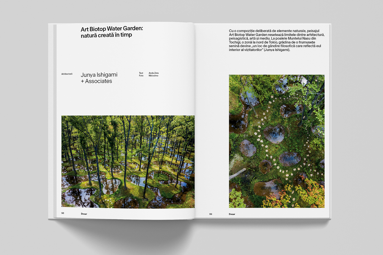 Dosarul prezintă: „renaturalizarea” râului Aire, un proiect de Atelier Descombes & Rampini; Pavilionul Alusta, instalat în curtea dintre Muzeul Designului și Muzeul Arhitecturii Finlandeze din Helsinki sau despre „cum arată o arhitectură gândită pentru insecte”; Little Island din New York, un parc peste râu realizat de Heatherwick Studio; Art Biotop Water Garden, o resetare a limitelor dintre arhitectură, peisagistică, artă și mediu, la poalele Muntelui Nasu din Tochigi; un dialog sincer și energic cu arhitectul peisagist Nicolas Triboi despre Bucureștiul ca „un colaj dadaist, plin de contradicții”, și multe altele.