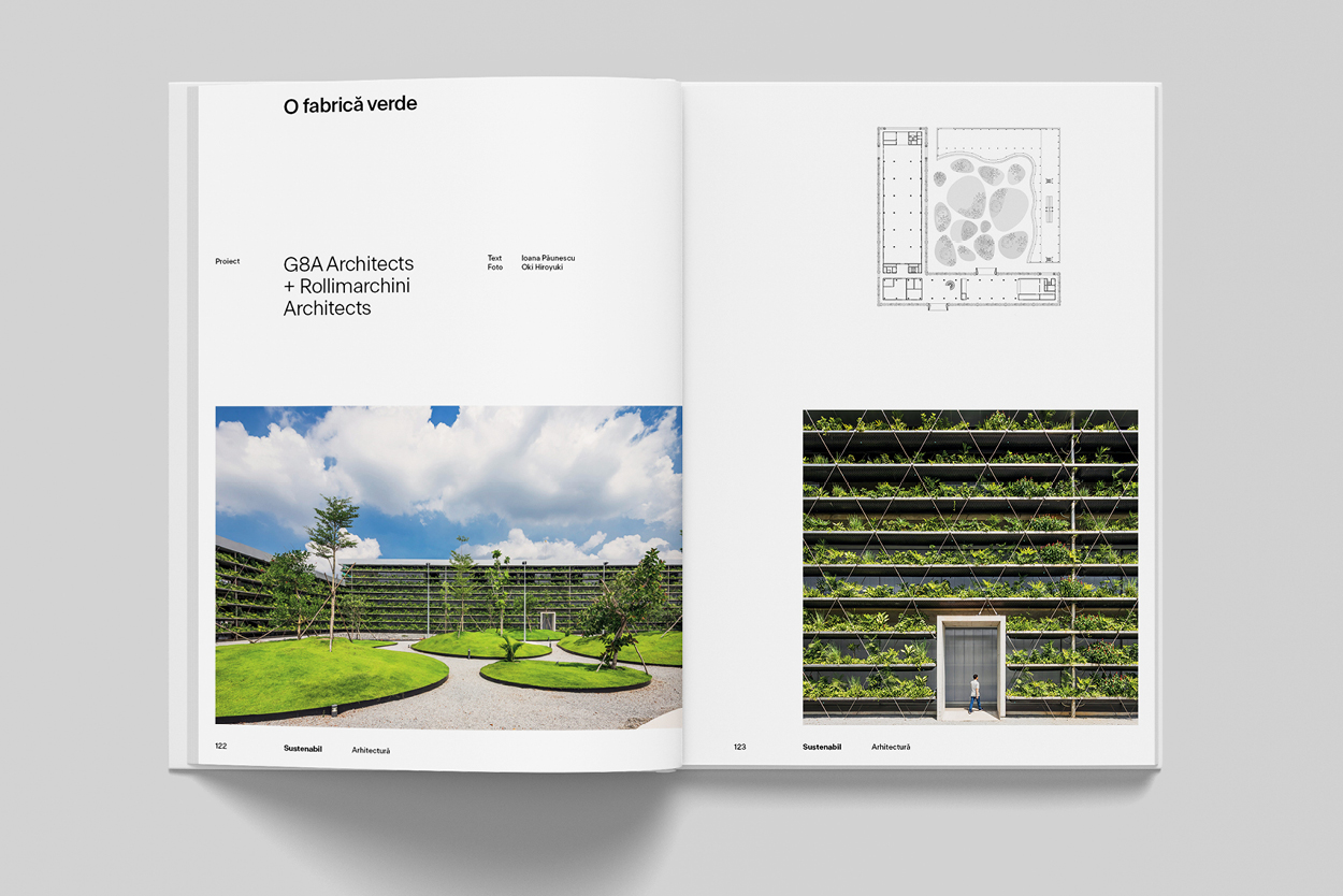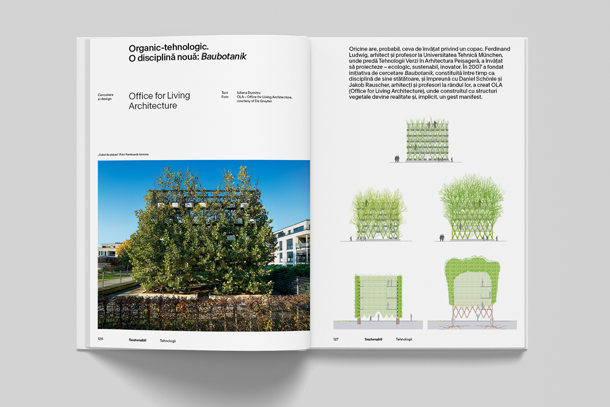 Sustenabil aduce în prim-planul capitolelor sale (Arhitectură, Tehnologii, Design) trei proiecte cu adevărat inovatoare, dintre care amintim: fabrica Jakob din Vietnam, realizată de G8A Architects Foto Oki Hiroyuki + Rollimarchini Architects – un exemplu de arhitectură sustenabilă din zona tropicală ce oferă o strategie de densificare pe verticală –, dar și despre Baubotanik, o disciplină organic-tehnologică predată la Universitatea Tehnică München de fondatorii OLA (Office for Living Architecture), pentru care construitul cu structuri vegetale devine realitate și, implicit, un gest manifest.