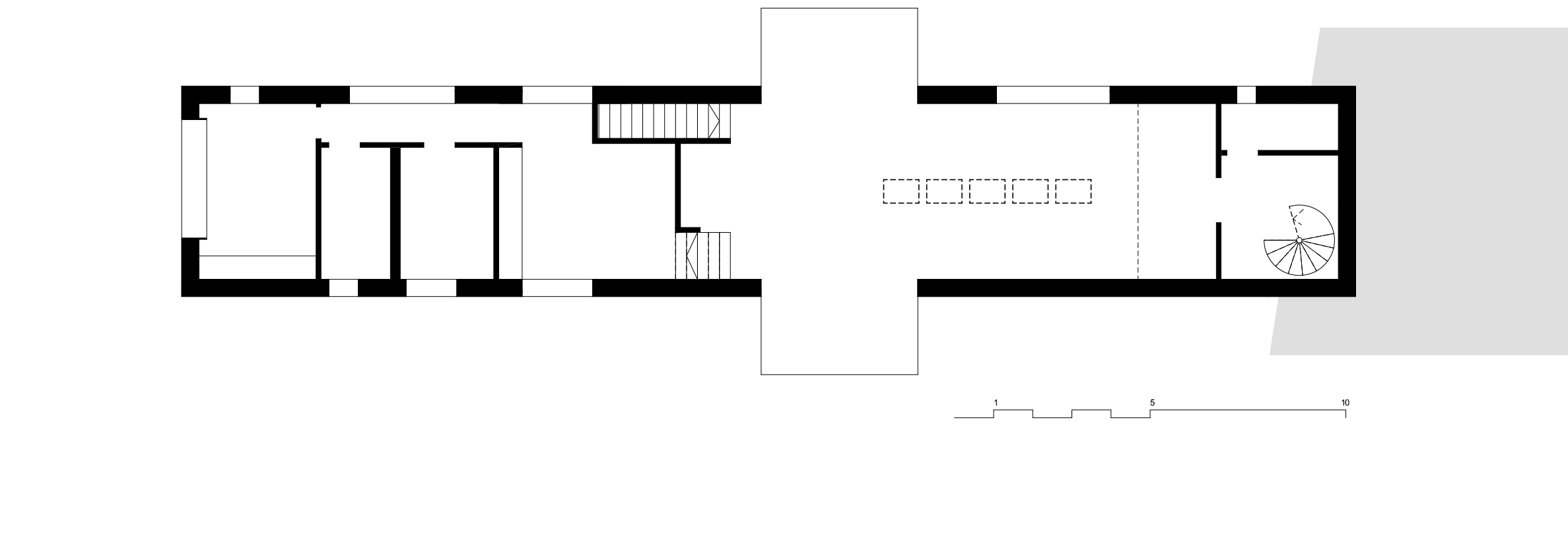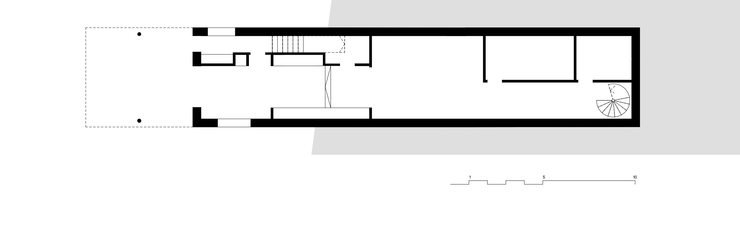 La capătul opus, un spațiu ce poate fi folosit atât ca birou, cât și pe post de cameră de oaspeți, se deschide spre grădina din spate și poate fi accesat din studio printr-o scară în spirală, realizată din oțel. O mică deschidere în peretele acestei camere permite observarea activității din atelier iar, dacă ambele uși sunt deschise, se creează o perspectivă neîntreruptă către fereastra din dormitor.