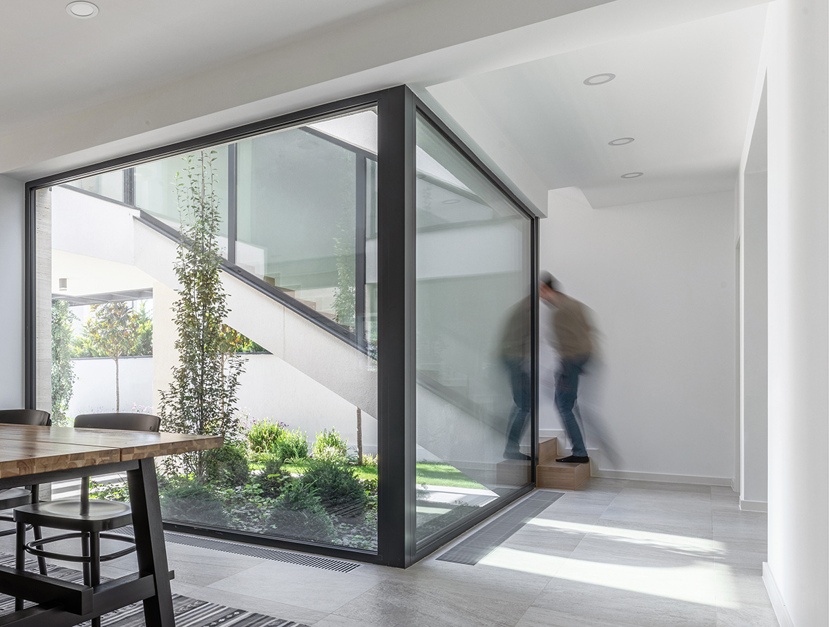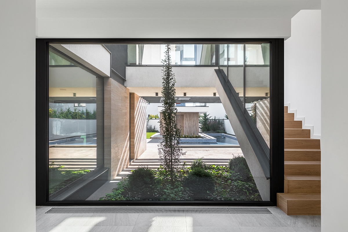 Încă de la intrarea în locuință, din zona vestibulului, se poate remarca o întrepătrundere armonioasă între spațiul construit și natură, întruchipată elocvent de grădina interioară ce constituie „inima verde” a casei, în jurul căreia sunt organizate spațiile de locuit. Amintind de grădinile integrate în casele japoneze, aceasta găzduiește un carpen care se înalță către nivelul superior și este complet vitrată, pentru a comunica deschis cu zona de zi și cu casa scării.