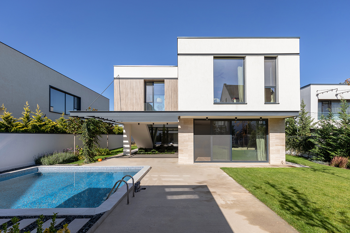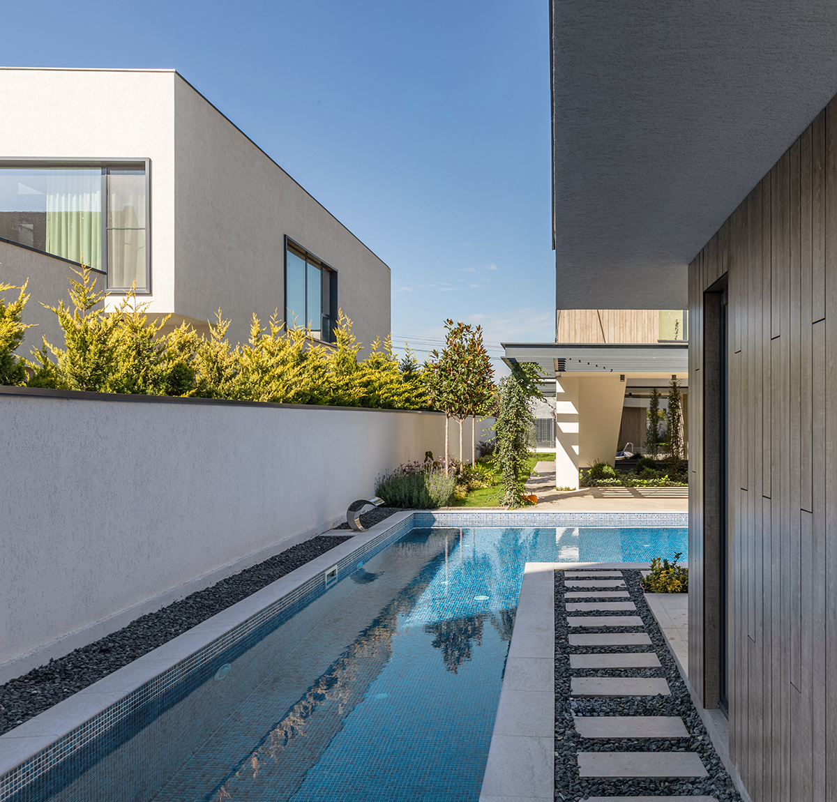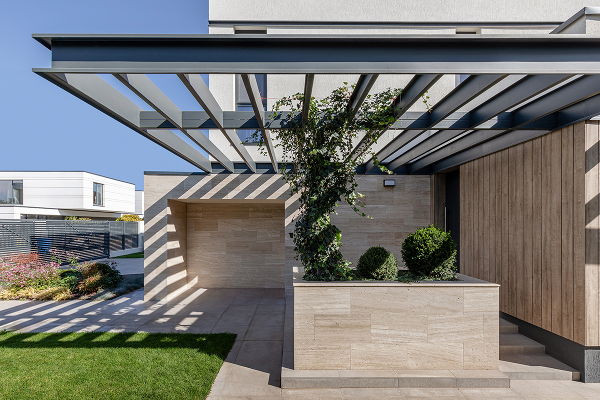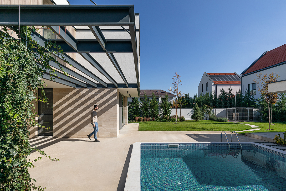 Astfel, s-a conturat o locuință pe două niveluri cu spații generoase, aflate într-o relație strânsă cu exteriorul. Parterul găzduiește zona de zi, iar etajul, zona de noapte, cărora li se adaugă un spațiu multifuncțional amplasat la subsol, dar care se bucură de iluminare și ventilație naturale. Accesul principal este marcat de o pergolă metalică, căreia îi corespunde o doua pergolă, prevăzută la trecerea din interior către curte, stabilind un sentiment de ritm și echilibru. În același timp, aceste structuri creează un spațiu tampon între interior și exterior, o tranziție între acoperit și neacoperit, și, de asemenea, oferă un binevenit refugiu în zilele călduroase de vară.