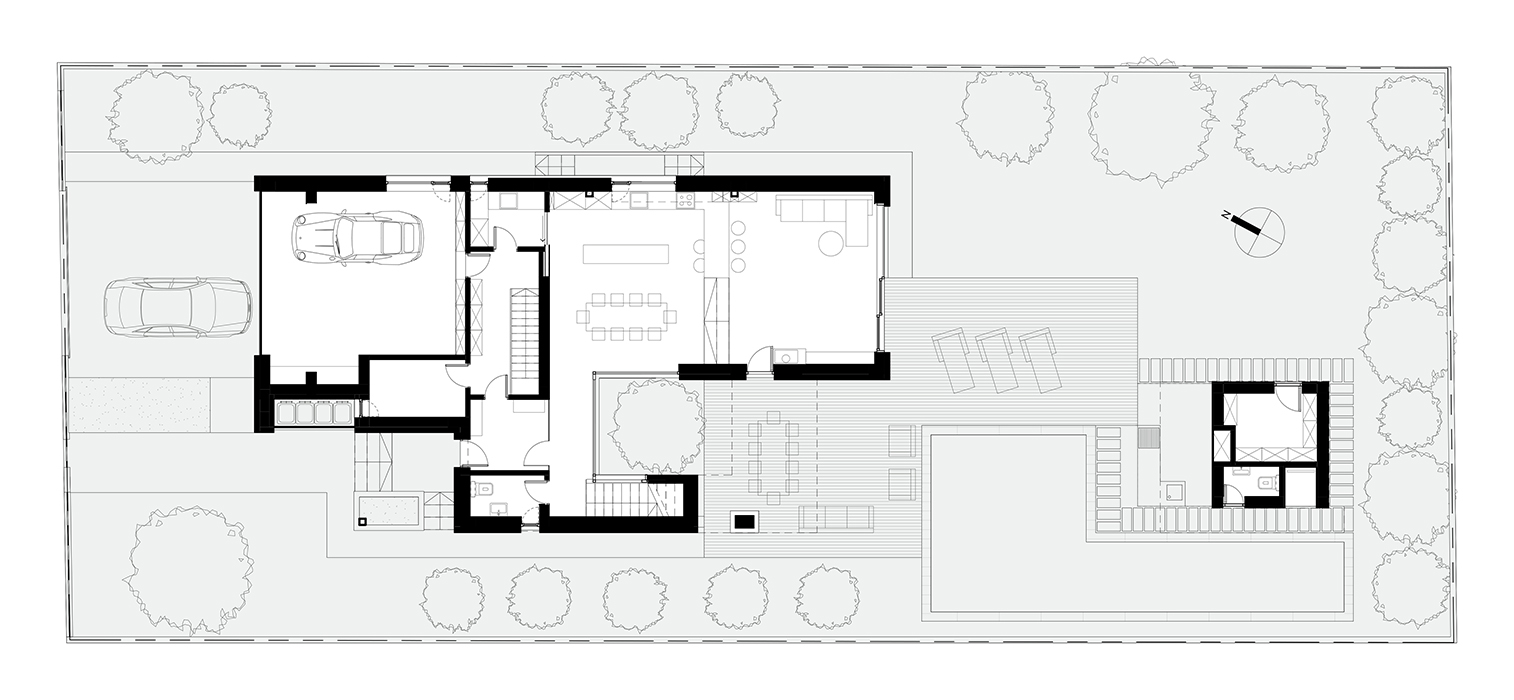 Parterul generos curpinde o bucătărie cu zonă de dining, care se deschide către un living coborât, această diferență de nivel permițând crearea unei zone de bar care comunică direct cu bucătăria. Din zona de dining, grădina interioară, elementul generator al locuinței, poate fi admirată asemenea unui terariu supradimensionat, în timp ce, la rândul său, livingul se deschide către exterior printr-un perete complet vitrat.