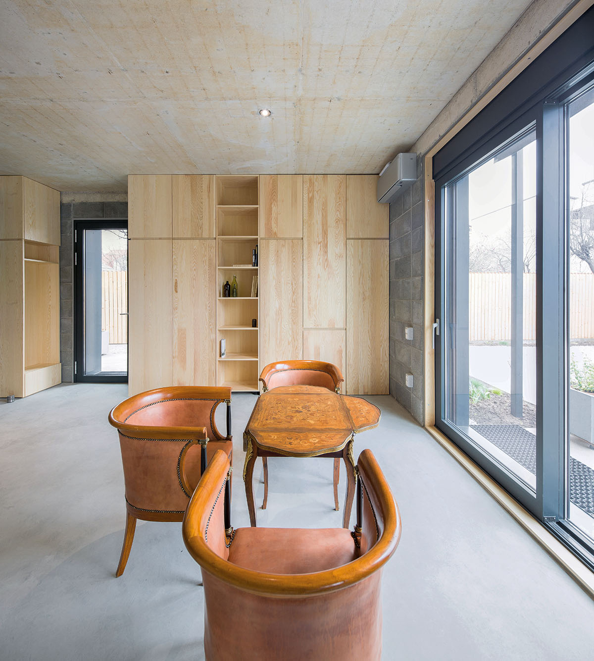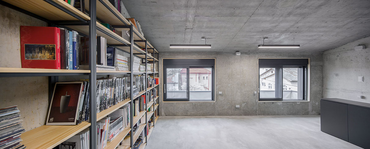 Atmosfera calmă a arhitecturii este accentuată de vegetația existentă anterior pe teren: bradul, gutuiul și liliacul, care adaugă o textură suplimentară fațadelor. Onestitatea structurală este un principiu fundamental aici: spațiul structură exprimă liber elementele de rezistență, unde betonul este actorul principal, devenind structură, finisaj de interior și de exterior, pardoseală, plafon.