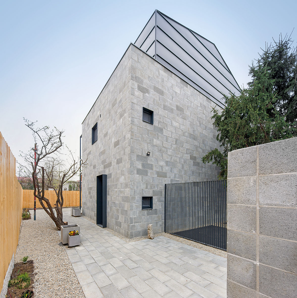 Camera grădină este atașată corpului principal al clădirii și se citește ca un obiect de design, ca un mobilier amplasat în aer liber. Această soluție personalizată oferă multe facilități: zonă de balcon, suport pentru plante, umbrire și copertină pentru locul de luat masa din exterior, spațiu de relaxare, conexiune cu livingul și bucătăria din parter. În mansardă sunt amplasate atelierul-bibliotecă, orientat către curte și deschis către o terasă de unde se pot observa lacul și spațiile verzi din curțile vecine. Fațadele păstrează un ritm mărunt al stereotomiei, închegând prezența arhitecturii casei în cartier. Toate elementele care compun locuința par atent articulate și dirijate, într-o compoziție care ține cont de un domestic adaptat la cerințele locuirii contemporane