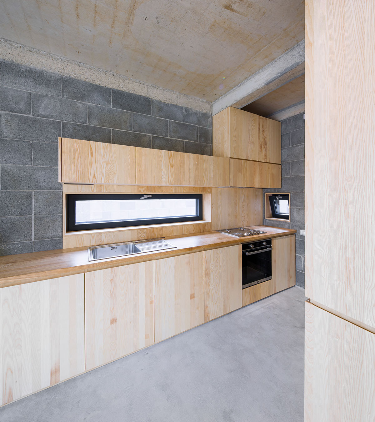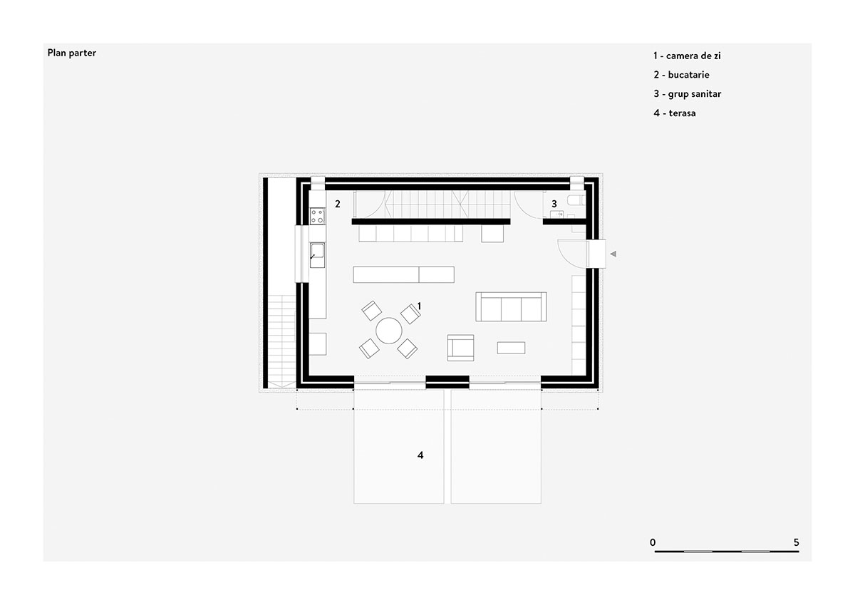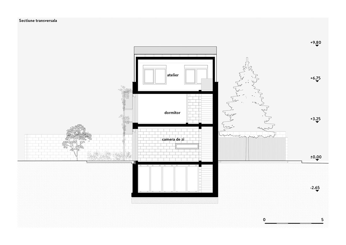 Arhitectura generează aici o suită de camere, atât interioare, cât și exterioare — o temă recurentă ce devine laitmotiv al proiectului. Camera living este conectată cu camera grădină, dar și cu bucătăria și locul de luat masa, adunând împreună spațiile intime ale casei. Camera de intrare, cu bradul și mașina, se conectează cu strada.