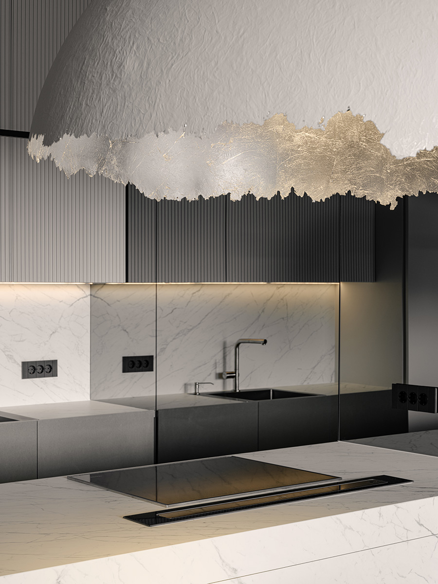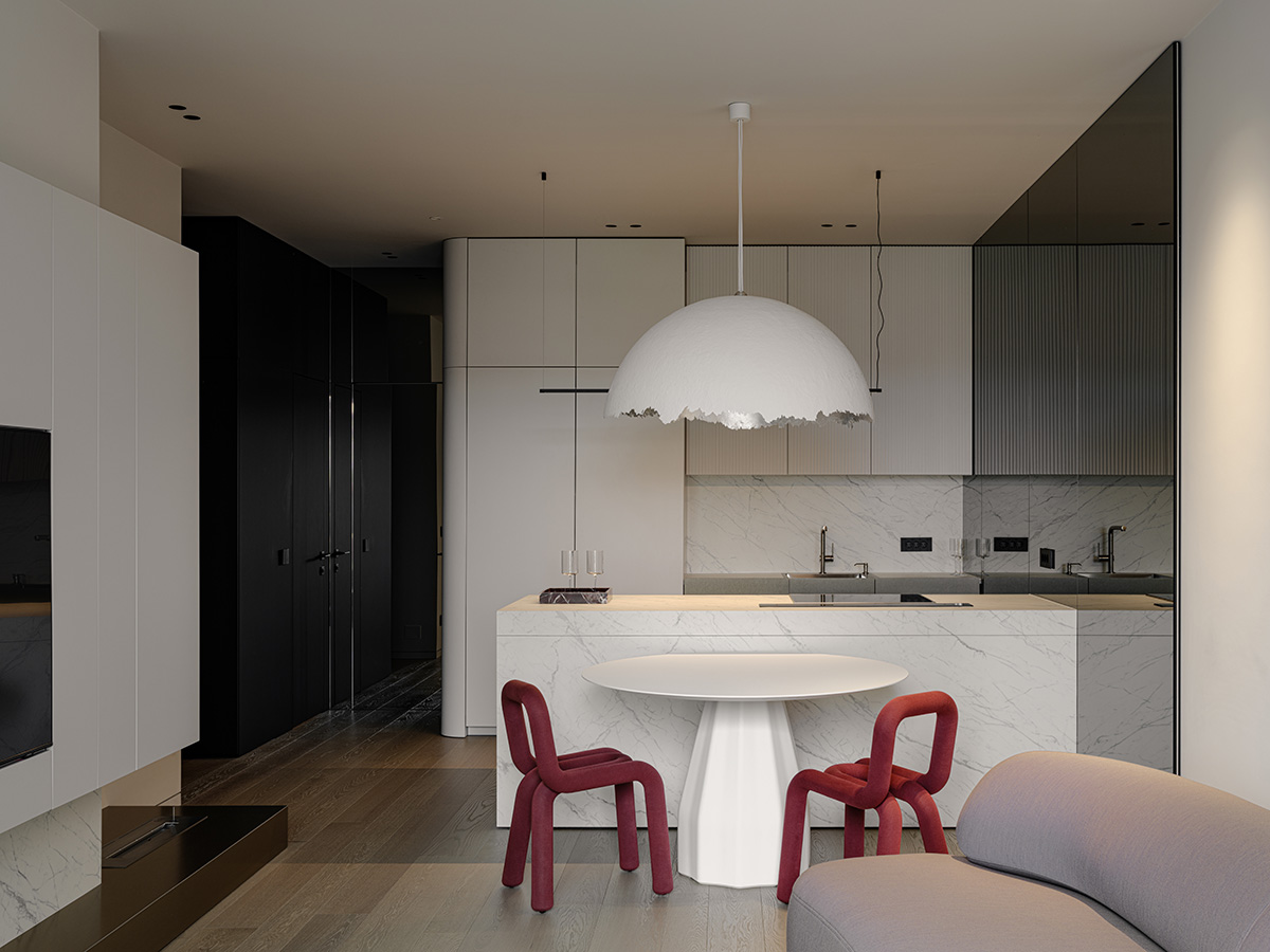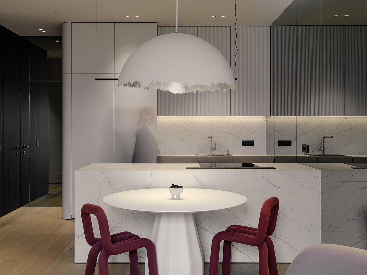 Inima amenajării este diningul, gândit ca un spațiu scenografic, o pauza sculpturală de la volumele simple si masive. Locul de socializare al familiei este intim, protejat de o cupolă fluidă, învăluitoare, ce pare să „curgă” din materia cadrului. În zona bucătăriei, toate volumele sunt jumătăți atent studiate pentru a fi completate de reflexia lor în oglindă. Tehnologia este integrată invizibil în întreaga zonă de zi tip open space, susținând funcționalitatea fără a altera puritatea volumelor și claritatea perspectivelor. Hotele se retrag în insulă, televizoarele se ascund în volume, iar benzile led ultra slim sunt invizibile pe timp de zi. Atât ușa către baia de serviciu, cât și trecerea către zona de noapte, au fost mascate și integrate în volumele de depozitare, menținând o imagine coerentă, fără întreruperi vizuale.