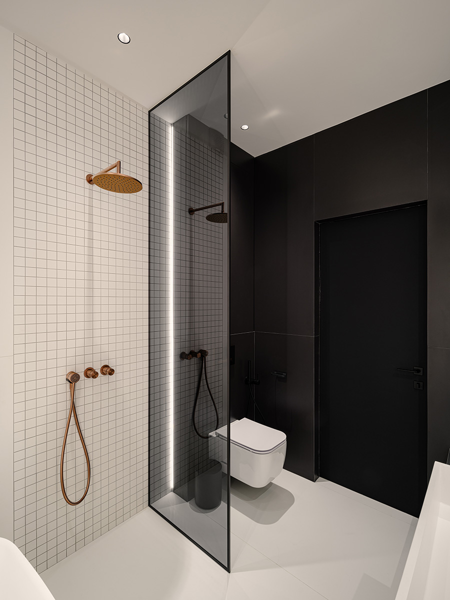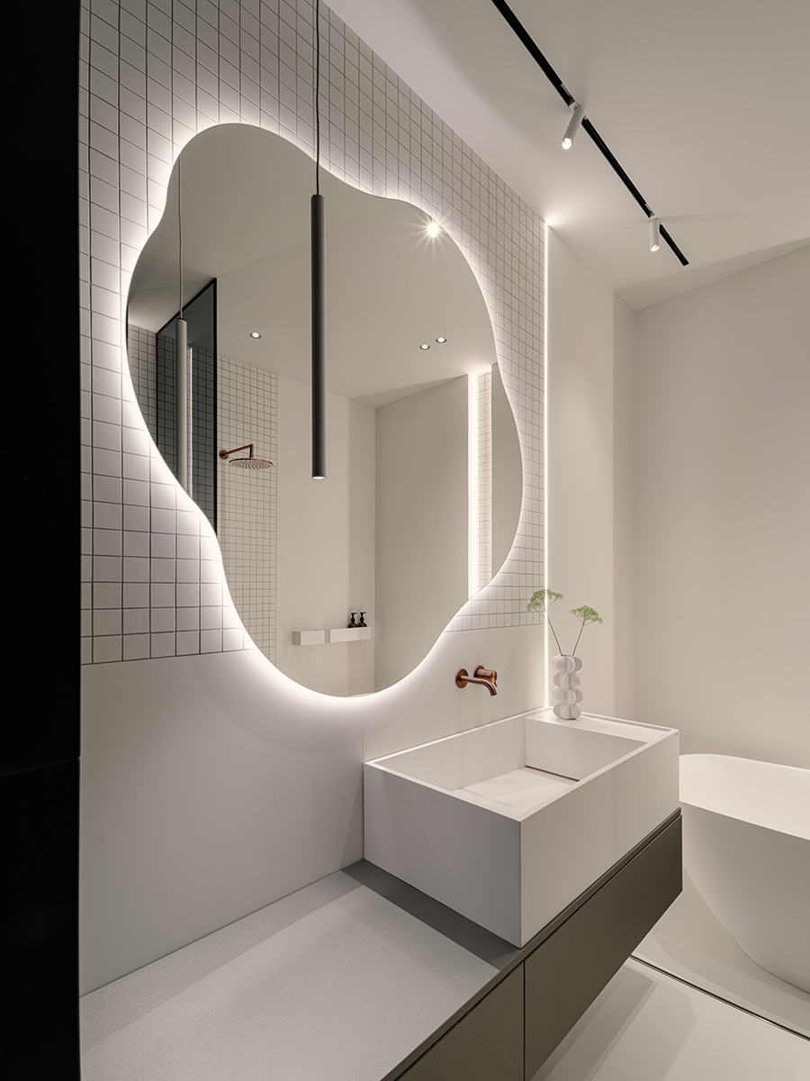 Baia adiacentă a fost gândită ca un spațiu-sanctuar, unde, în ciuda absenței ferestrelor, lumina devine elementul central, prin continuarea paletei alb mat. Mai mult, prin integrarea de scafe verticale cu lumină indirectă, volumul încăperii este conturat subtil, creând o ambianță calmă și reconfortantă.
