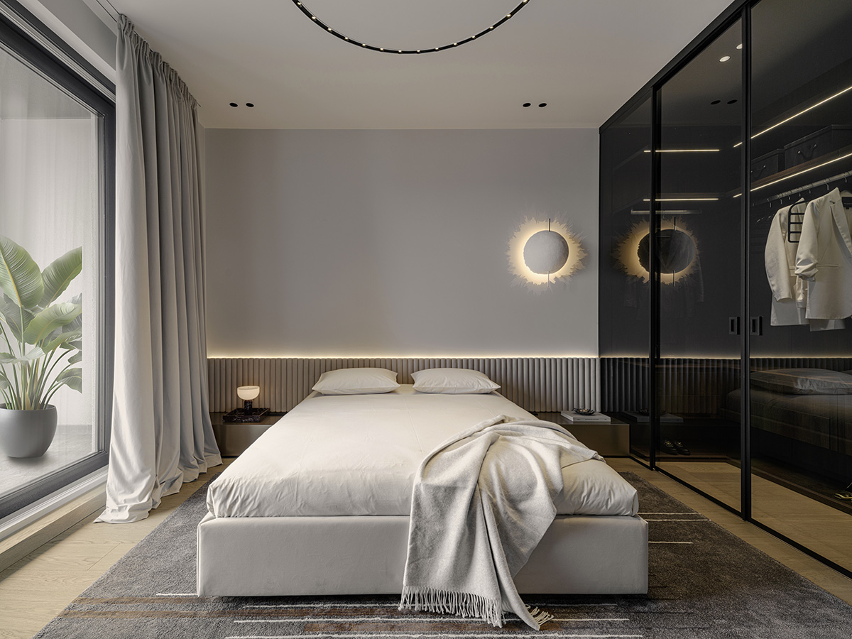 Dormitorul matrimonial este un spațiu generos, care a permis integrarea unor zone suplimentare de depozitare și a unui dressing walk-in încăpător și eficient organizat, realizat din sticlă fumurie, ce reflectă subtil ambianța și iluminatul din încăpere, în același timp păstrând vizibilitatea, pentru o orientare ușoară. O mini-replică a cupolei din dining conferă personalitate si unicitate spațiului, evocând un joc cosmic de lumină similar unei eclipse solare. Paleta cromatică este alcătuită din tonuri de alb umbrit, așezate pe o bază calmă de parchet desaturat, și completată de un covor în nuanțe pământii, care echilibrează vizual camera.
