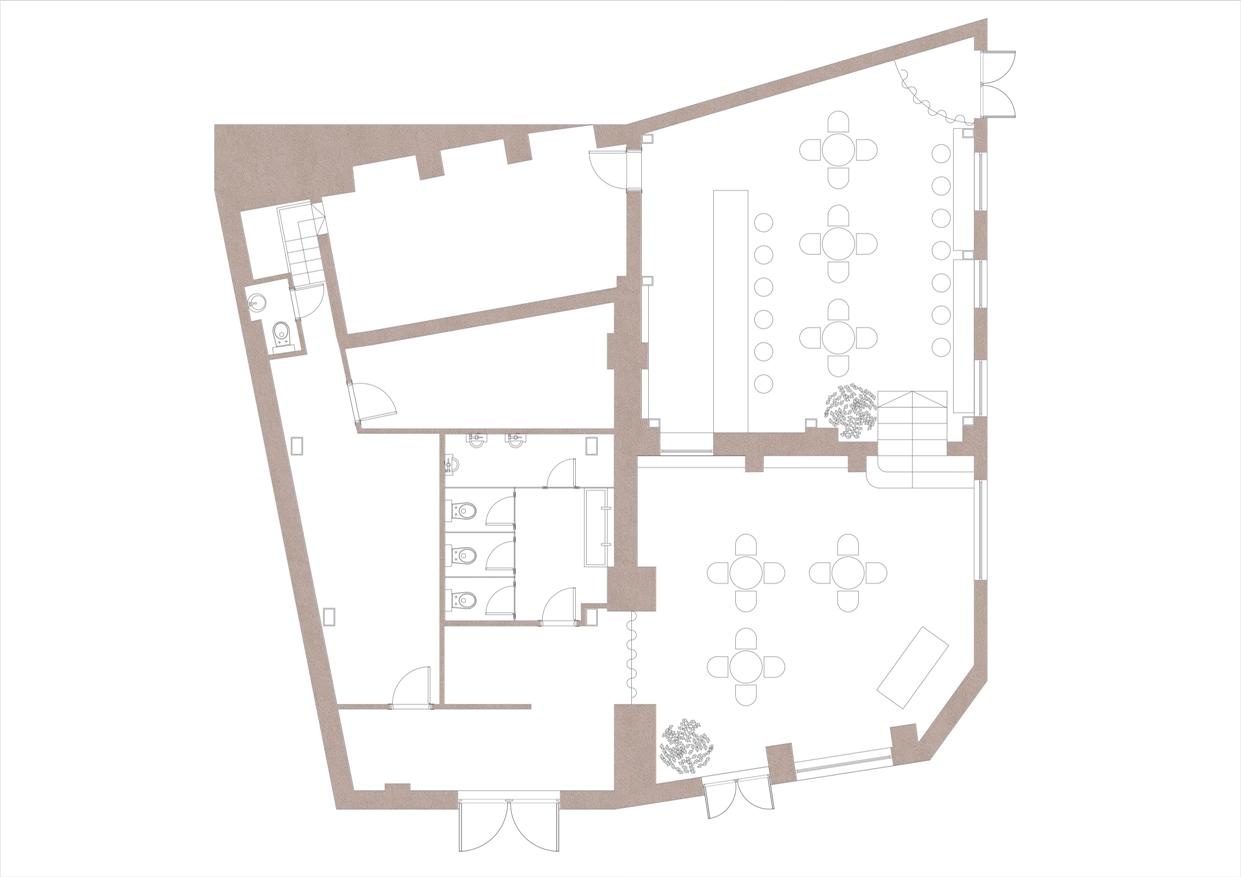 În spațiu au fost delimitate trei zone, cea a barului, ringul de dans și zona grupului sanitar. Cea mai spectaculoasă prin detalii și ansamblu este zona barului: oglinzile care dau profunzime spațiului, rafturile din oțel inoxidabil și benzile LED, plafonul arcuit… Apariția unor elemente ludice, colorate într-un spațiu industrial, în general auster în exprimare, (mobilier, dispunerea corpurilor de iluminat, plante) oferă dinamism și atrage priviri și trupuri pe ringul de dans, care propune propria experiență senzorială.
