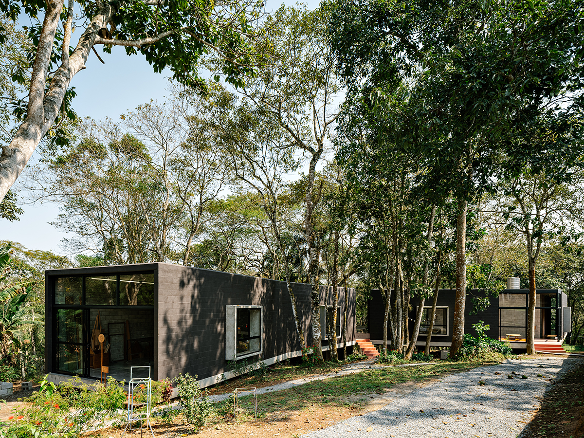 Urmând o potecă naturală printre arborii înalți și supli, locuința se dezvoltă pe un singur nivel, penru a facilita atât interacțiunea între ocupanți, cât și transportul pieselor și materialelor necesare pentru realizarea lucrărilor de artă. Patru volume distincte, rectangulare și ușor rotite, unite doar la nivelul bazei din panouri de beton, se înlănțuie asemenea unor vagoane de tren, creând o succesiune de închideri și deschideri.