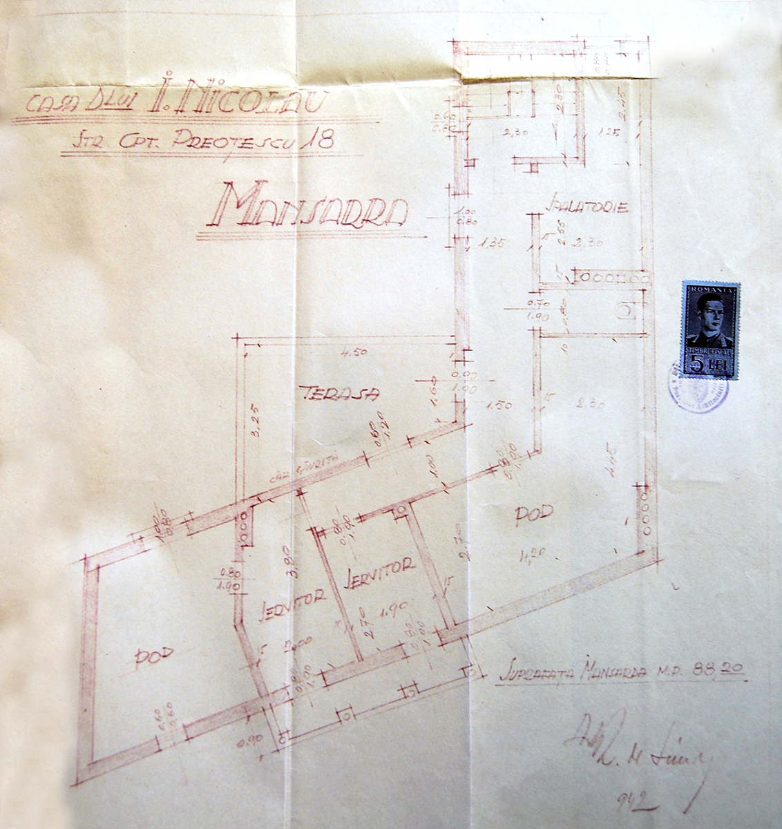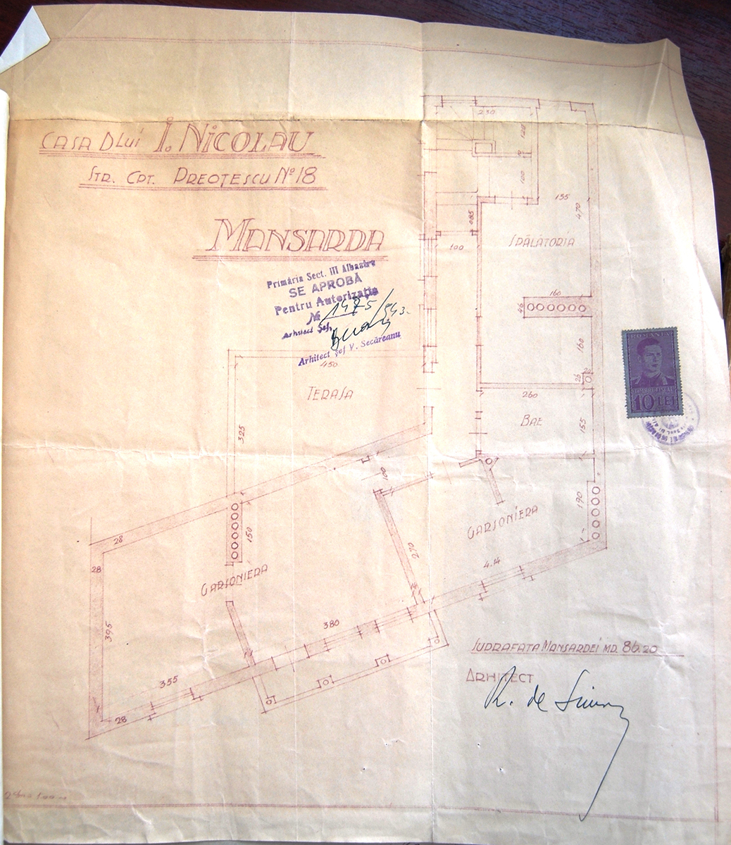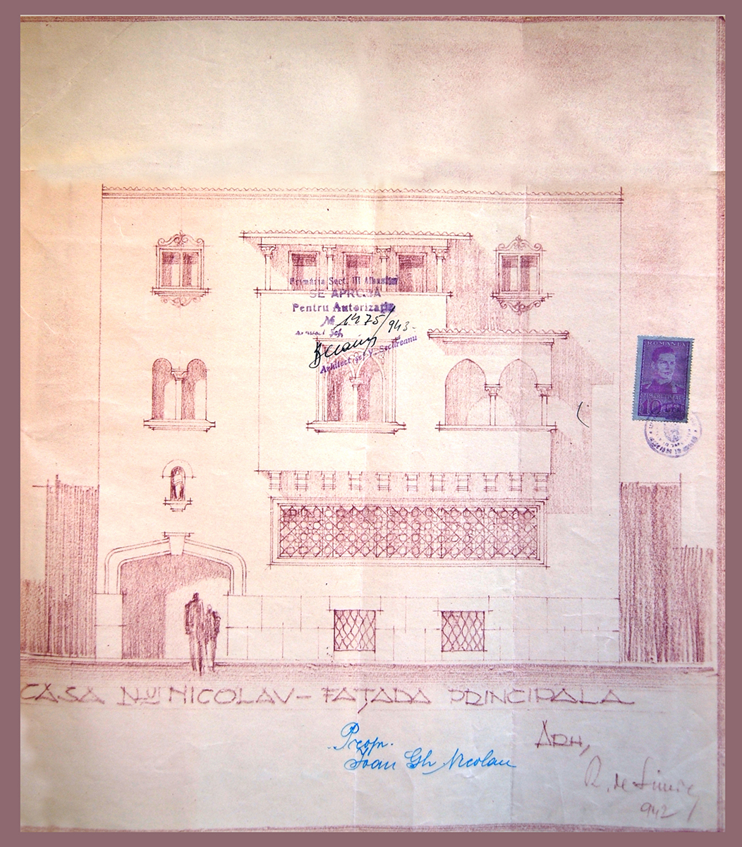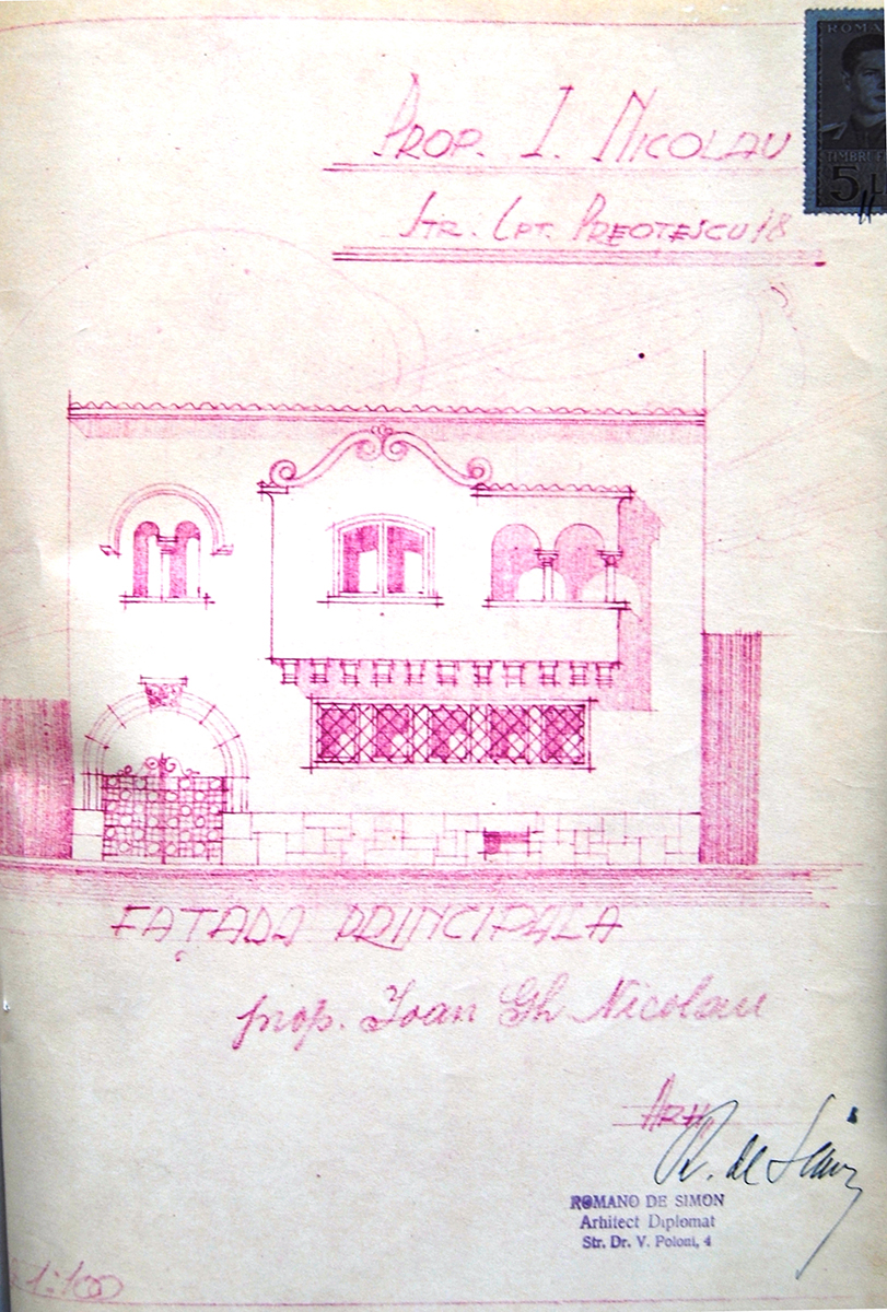 Dosarul de autorizare III Albastru nr. 30A/1943 relevă o adevărată epopee a acestui proiect, conținând nu mai puțin de 4 proiecte de autorizare anterioare, cu variante diferite, a unui imobil demarat în 1941 sub autorizația 12359/1941 prin care proprietarul cerea „O construcție pivniță, parter, etaj, mansardă servind drept locuință și atelier pentru lucrat lumânări de ceară”. Terenul generos, sub forma „curelelor” lungi și înguste, avea inițial o suprafață de 1 297 mp, cu un front la stradă de 12,60 m pe 121 m adâncime (astăzi, proprietatea e redusă la arealul casei construite). Proprietarul (Ioan Gh. Nicolau) nu va respecta proiectul autorizat (deși arhitectul a luat construirea imobilului sub răspundere proprie), edifică mai mult, iar primăria îi va cere să depună documente noi de autorizare. Se vor mai depune dosarele 10458/1942 și 28603/1943. Mai mult de muncă pentru Romano de Simon și mai multe desene frumoase de admirat pentru cei din ziua de azi… Anterior soluției existente pe teren, Romano de Simon propune un imobil S+P+1E, cu o fațadă în stil mediteraneean, având câteva elemente definitorii care vor fi păstrate și în soluția finală de pe teren. Însă propunerea inițială parcă era mult prea săracă în expresivitate.