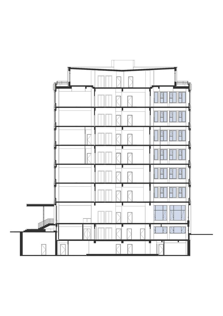 Dincolo însă de ceea ce se vede cu ochiul liber, arhitecții ne-au dezvăluit câte ceva și din anvergura inginerească și arhitecturală a intervențiilor lor, pentru a aduce clădirea la cele mai înalte standarde contemporane: s-a realizat consolidarea structurală pentru încadrarea acesteia în normele actuale; a fost integrat un sistem performant de HVAC pentru climatizarea eficientă și asigurarea confortului utilizatorilor; în ceea ce privește anvelopanta, panourile prefabricate existente au fost termoizolate la interior și placate la exterior cu klinker de cărămidă, iar ferestrele au fost înlocuite cu unele de eficiență energetică sporită.