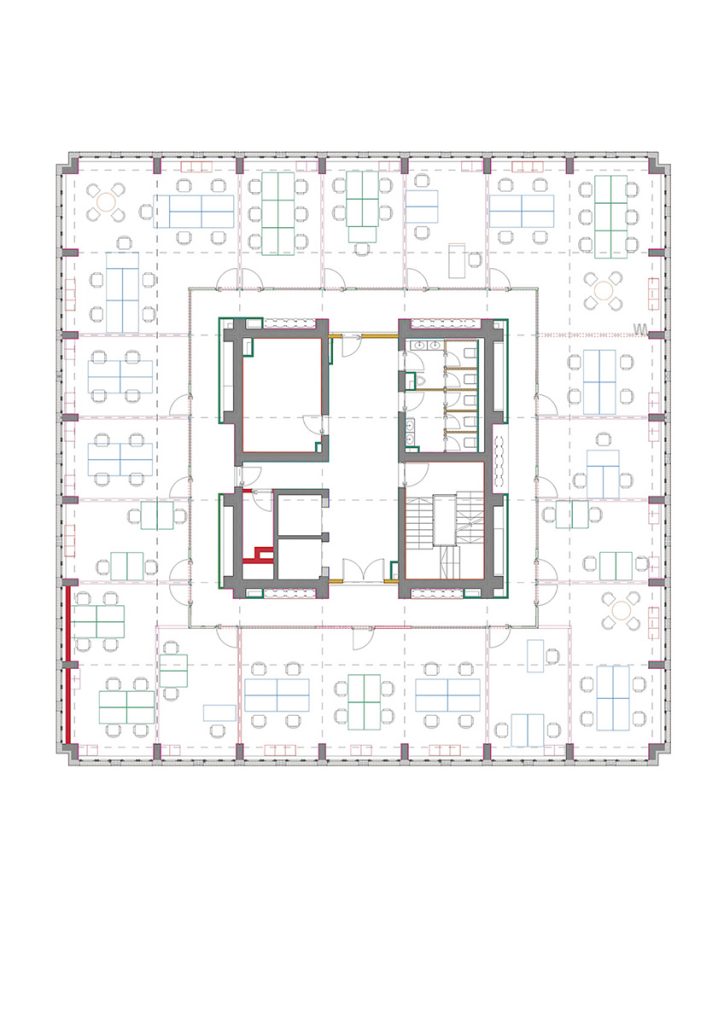 și al adecvării la noile coordonate ale vieții de birou, cu toată diversitatea ei: s-au trasat zone ample de tip open-space, compartimentări din sticlă, spații de birouri de diferite dimensiuni și săli de conferințe. Nodul central adăpostește funcțiunile complementare, respectiv circulațiile verticale, grupurile sanitare și chicinetele.