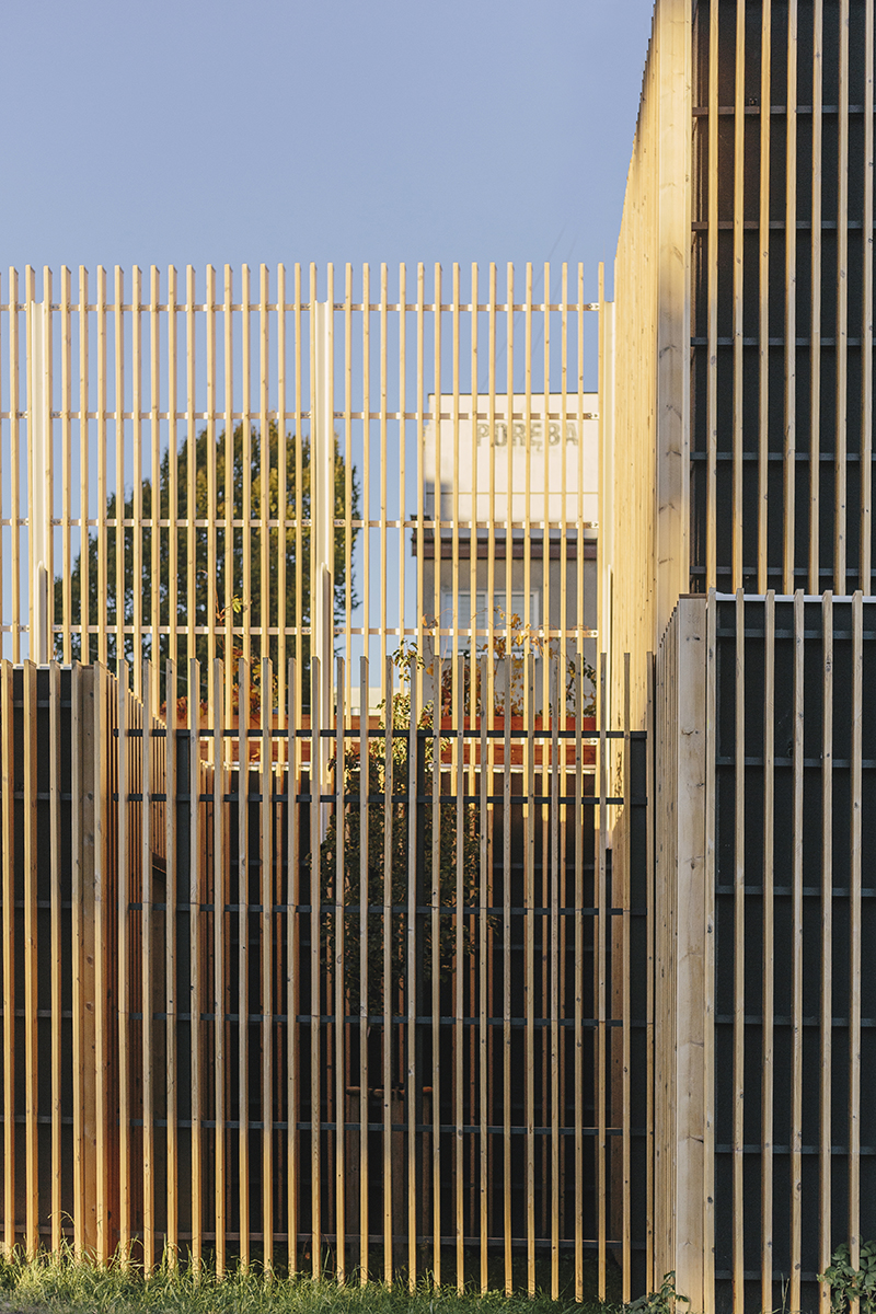Fațadele orientate către stradă sunt acoperite cu lamele verticale de lemn, a căror textură îmbunătățește eficiența ecranului acustic și servește drept suport pentru plantele cățărătoare. În schimb, fațadele dinspre curte sunt finisate într-o nuanță caldă de alb, formând o compoziție arhitecturală și materială coerentă în combinație cu mobilierul și vegetația din exterior.