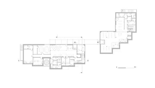 Ansamblul a fost proiectat în așa fel încât să constituie un buffer acustic, închis față de străzile aglomerate și deschis spre curtea interioară. Volumele răspund particularităților sitului și se aliniază cu linia clădirilor existente, cu retrageri de-a lungul fațadei, care contribuie la izolarea fonică. Divizarea clară între cele două funcțiuni – centru comunitar și bibliotecă – deschide o cale de comunicare vizuală cu împrejurimile, sporind lizibilitatea și aliniind structura cu traseele pietonale existente.
