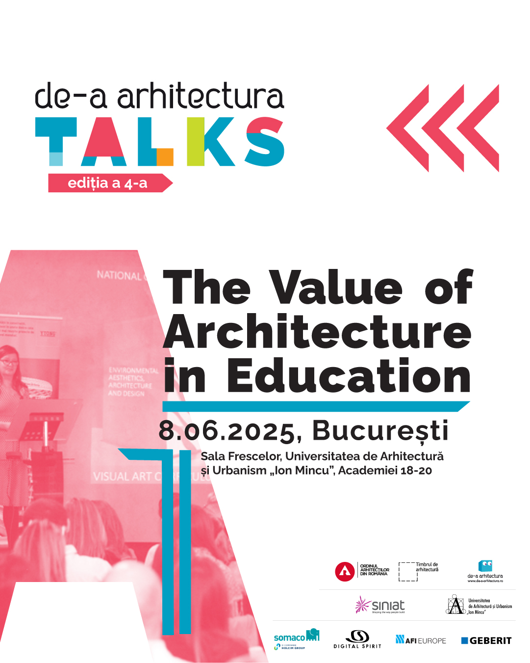 Pe 8 iunie 2025, în Sala Frescelor a Universității de Arhitectură și Urbanism „Ion Mincu” dinBucurești, Asociația De-a Arhitectura invită publicul larg la a patra ediție a conferinței internaționale „De-a Arhitectura TALKS” – un spațiu viu de dialog între profesioniștii mediului construit și profesorii din ciclul preuniversitar.
