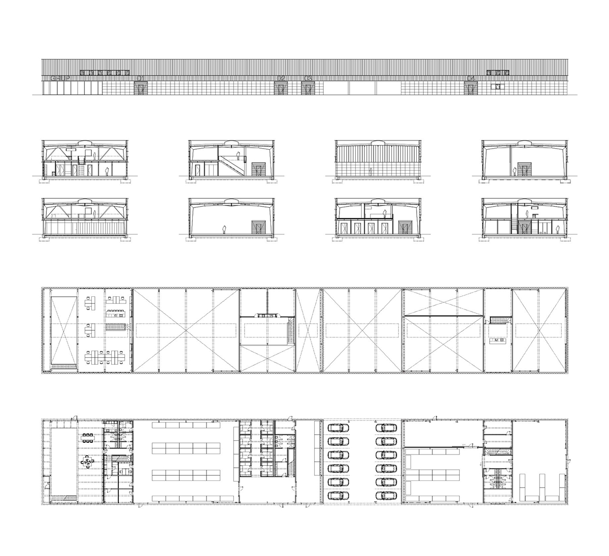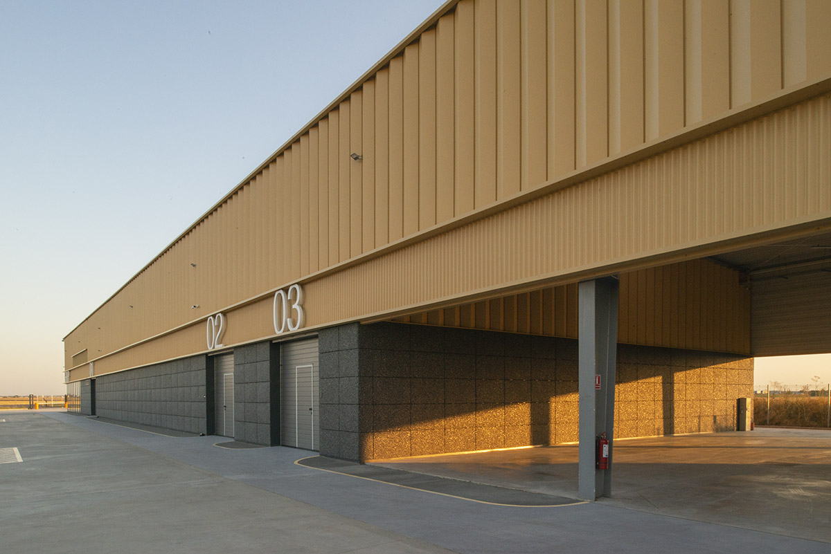 Toate cele patru fațade sunt organizate în trei registre orizontale, o decizie arhitecturală care subliniază caracteristica definitorie a acestei clădiri – lungimea. Din punct de vedere constructiv, fațadele ventilate sunt proiectate în sistem de casete structurale metalice prevopsite, aparente la interior, termoizolate cu vată minerală bazaltică și finisate diferențiat la exterior în funcție de registrul orizontal căruia îi aparțin. Pentru cel de la bază, profitând de expertiza și deschiderea către experiment a clientului-constructor, am testat și dezvoltat panouri de 100/60 cm montate pe substructură metalică, dintr-un material folosit în prezent pentru pardoseli, via rustik, un aglomerat gri închis, din agregate de granit lipite cu o rășină poliuretanică flexibilă, transparentă, stabilă la UV și rezistentă la apă.