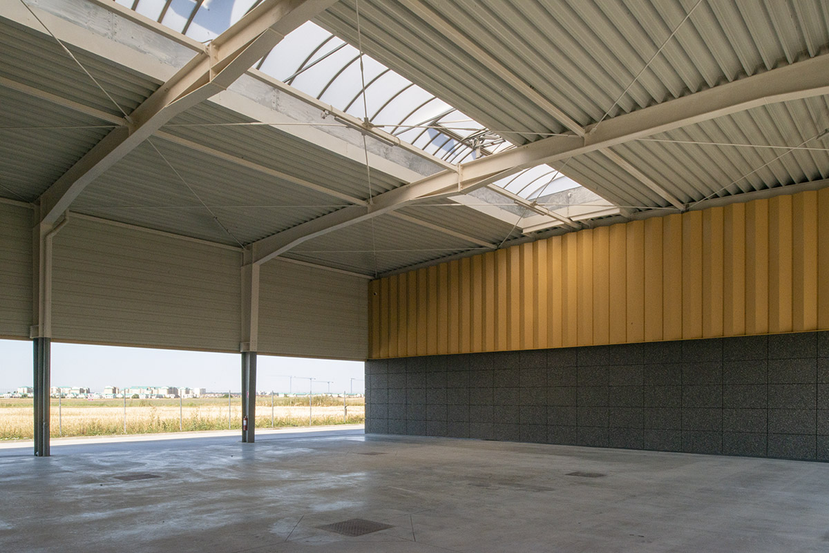 Configurația spațială liniară a clădirii este obținută prin repetarea de 20 de ori, la un pas de 6 m, a unui cadru prefabricat de oțel, cu deschidere de 18 m și înălțime liberă de 6.20 m ce permite ca, în anumite zone, să existe supante sau etaje, necesare unor funcțiuni precum zona de birouri, sala de mese, sau atelierele. Liniaritatea dominantă este întreruptă vizual și funcțional, la nivelul parterului, de un interval liber format din trei travei, cu rolul de spațiu de parcare acoperită, pe dublă înălțime. Acest volum liber va putea permite o extindere in viitor, în eventualitatea (care deja se conturează) a necesitații suplimentării spațiilor interioare.