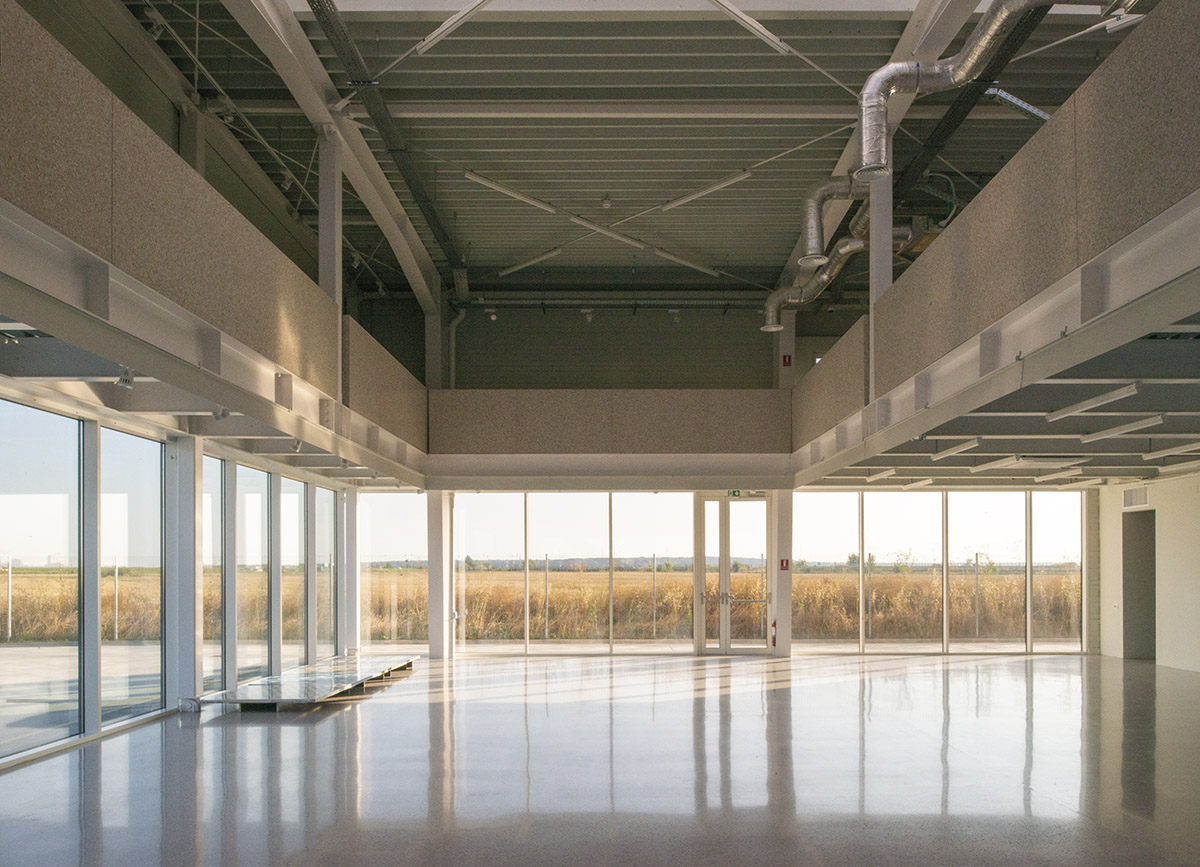 Zona de showroom, puternic vitrată, aflată în relație directă cu drumul de acces, precum și spațiul destinat birourilor de la supantă, au pardoseli din terrazzo, o suprafață nobilă, într-un contrast dorit cu aspectul frust al restului elementelor ce definesc atmosfera interioară, iar pentru restul spațiilor, fie ele depozite, spații de producție, laboratoare sau vestiare, s-au folosit pardoseli industriale.
