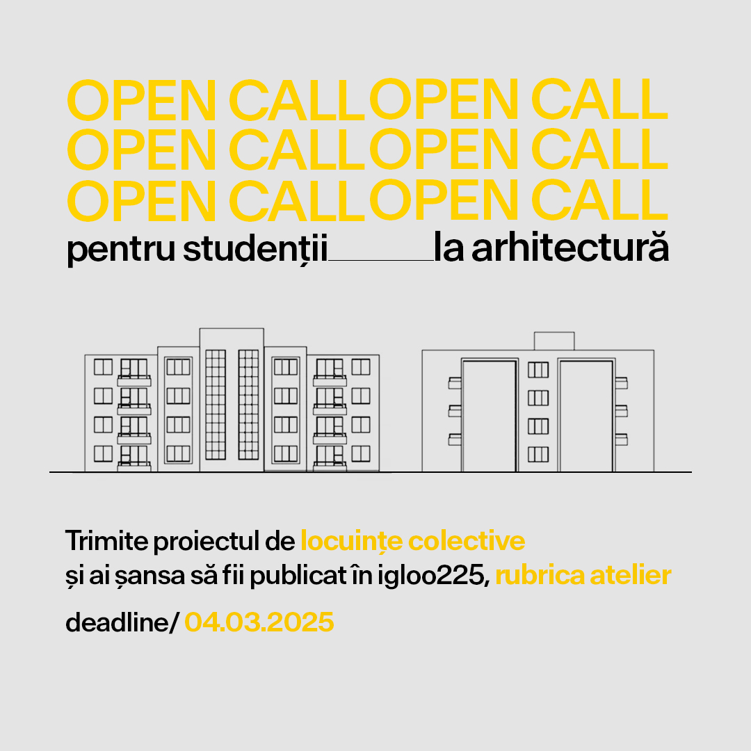 În sumarul revistei igloo225, lansăm un open call special pentru studenți. Dacă ai un proiect de locuințe colective pe care l-ai realizat în cadrul unui atelier de facultate, singur sau împreună cu colegii, trimite-l până pe 4 martie 2025 și ai șansa să-l vezi publicat într-o revistă de specialitate recunoscută, care îți poate deschide noi oportunități profesionale.