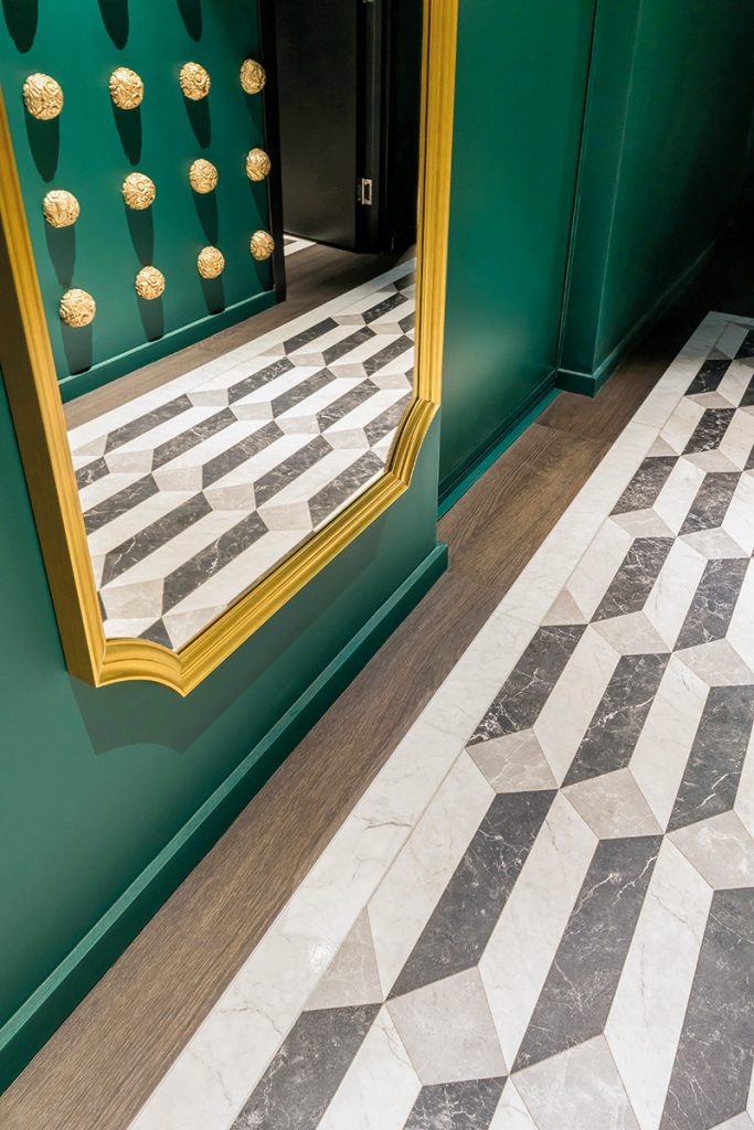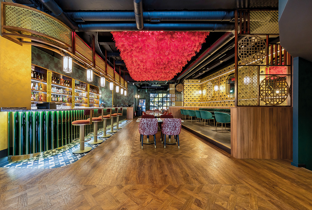 Paleta cromatică a interiorului – roșu, auriu, negru – evocă rafinamentul cultural asiatic, iar structura și tonul cald de maro închis al LVT-ului pun în valoare detalii iconice, precum ciucurii roșii, și delimitează subtil zonele funcționale fără a întrerupe fluiditatea spațiului. Combinația dintre sobrietatea centrului și energia ludică a zonei barului se reflectă în modulare: borduri, inserții și scheme de montaj personalizate ce oferă flexibilitate creativă și coerență conceptuală.