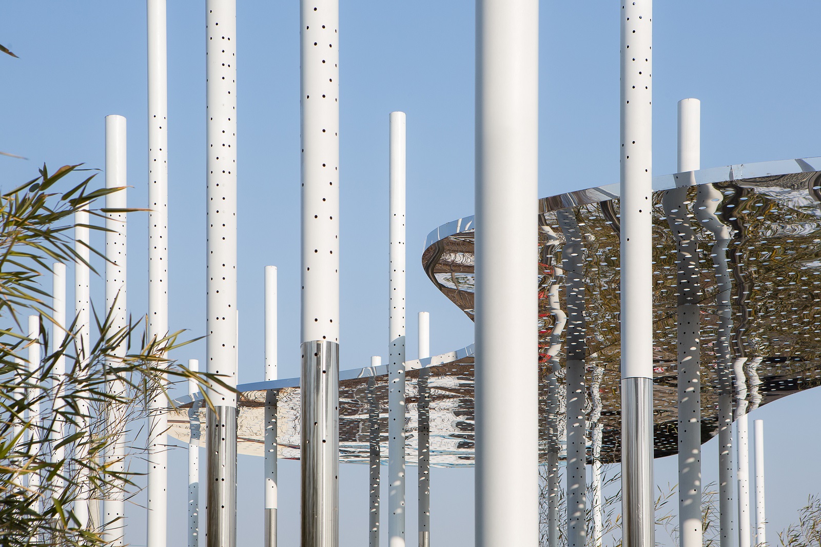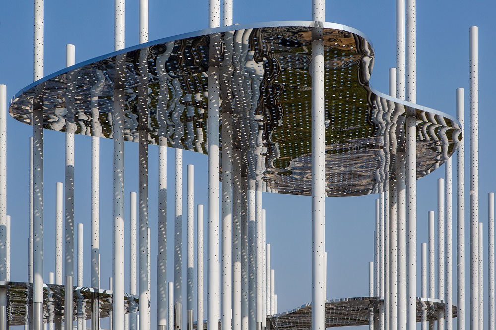 Pentru cei care se vor opri și explora, instalația va fi prilej de cugetare și descoperire în detaliu: tijele devin o pădure, un râu din marmură neagră care îndeamnă la pași către muntele din zare. Iar privirea ce se ridică va descoperi canopee-nori – de fapt oglinzi care captează și transmit mersul lumii.