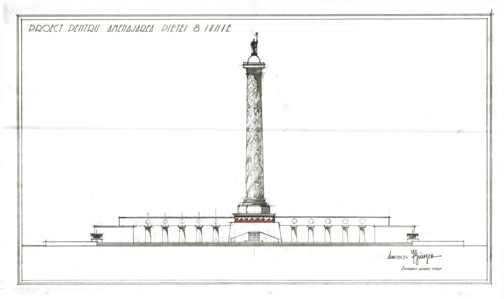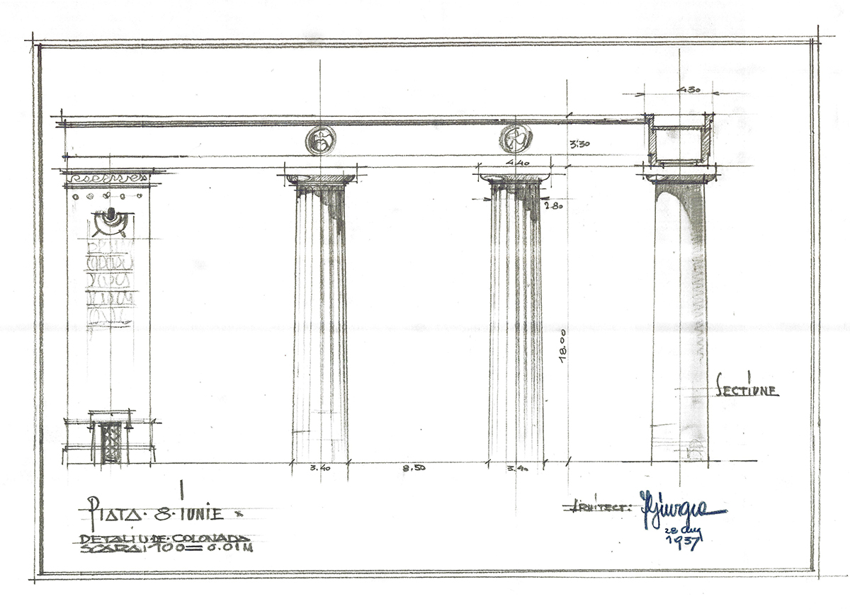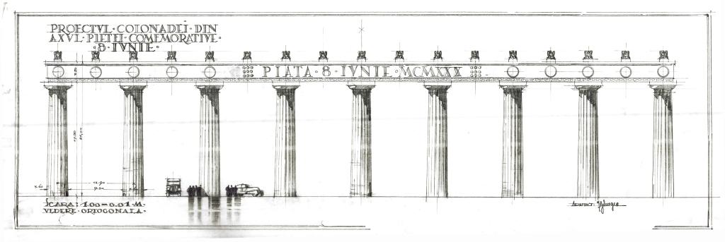 Într-una dintre variante, Giurgea introduce chiar o columnă monumentală – o replică modernă a Columnei lui Traian – plasată axial între coloane, în spiritul arhitecturii civice romane.
