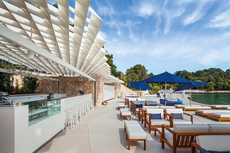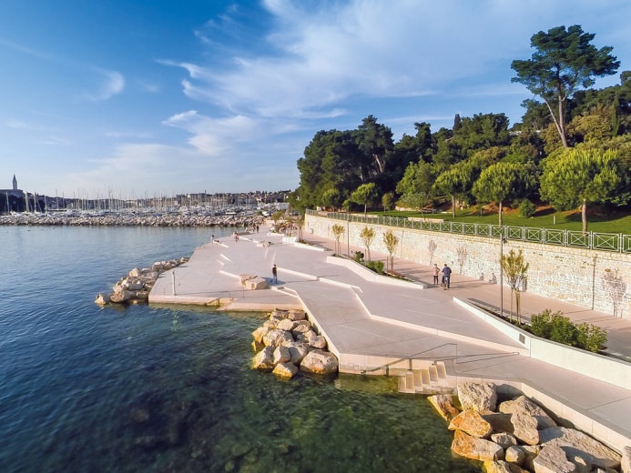O echipă de tineri arhitecți croați au pus în practică un nou concept de plajă turistică, prin îmbinarea confortului şi serviciilor de rigoare cu caracteristici corespunzătoare unui spaţiu public veritabil, totul în spiritul unui deplin respect faţă de mediu şi de liniile naturale ale peisajului. Plaja Mulini este situată într-o zonă atrăgătoare şi activă a oraşului Rovinj, comunicând în mod direct cu promenada principală din centrul acestuia.