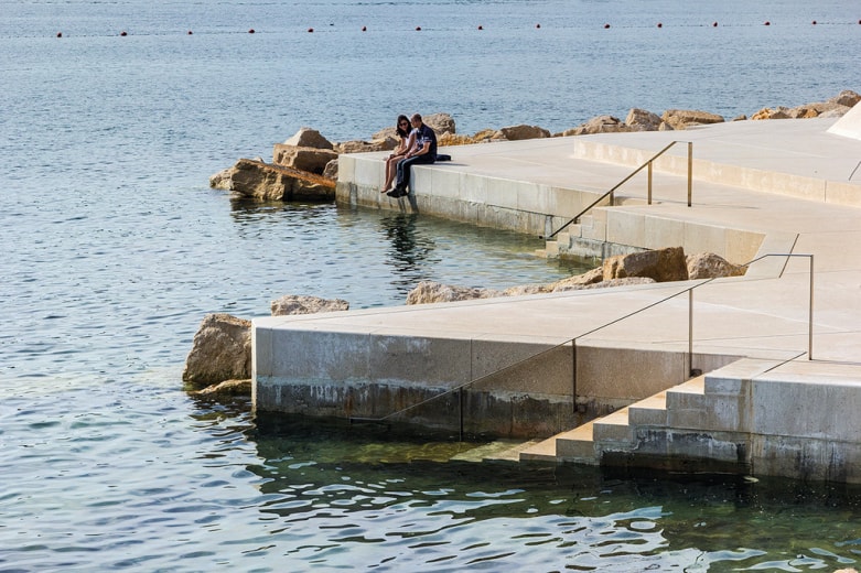 De asemenea, ea este adiacentă hotelurilor Mulini, Lone şi Eden, la rândul lor amplasate în contextul unei importante zone verzi, formată dintr-un parc municipal, Punta Corrente, şi pădurea din apropiere. Astfel, plaja reprezintă o extensie a spaţiului public urban şi, dincolo de faptul de a constitui o destinaţie în sine, realizează legătura dintre acesta şi parc. Una dintre cele mai mari provocări în realizarea proiectului, atât din punct de vedere tehnic, cât şi creativ, a fost relaţionarea cu terenul existent şi, în special, cu marea, element crucial şi, în acelaşi timp, variabil, din pricina mareei care face ca nivelul său să fluctueze cu aprox. 80 cm pe perioada unei zile. Soluţia a fost de a crea, în cadrul plajei, două zone diferite: o „fâşie” de teren cuprinsă între debarcader şi pavilion, aflată sub acţiunea directă a valurilor, şi un golf în miniatură mult mai calm, cu o plajă de prundiş.